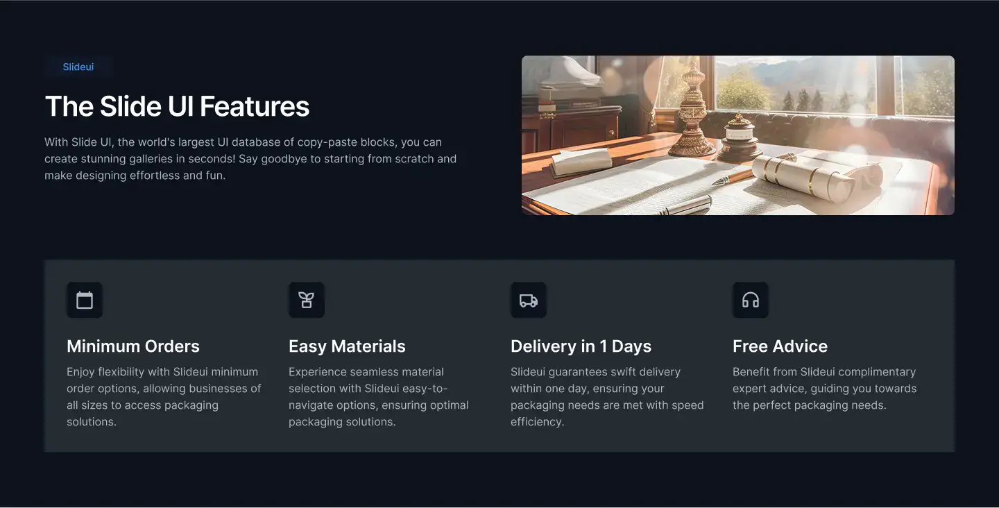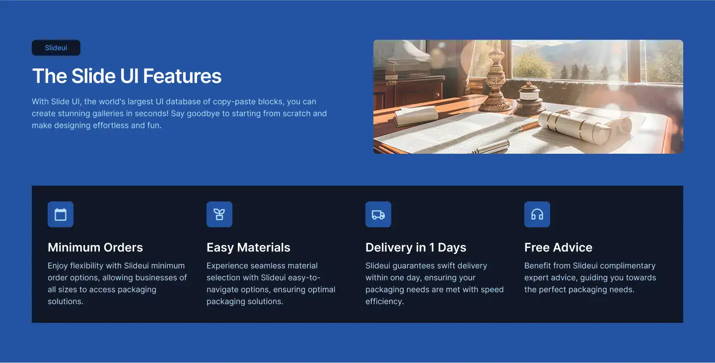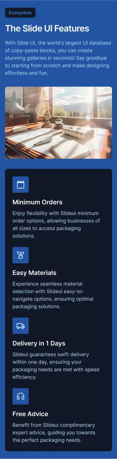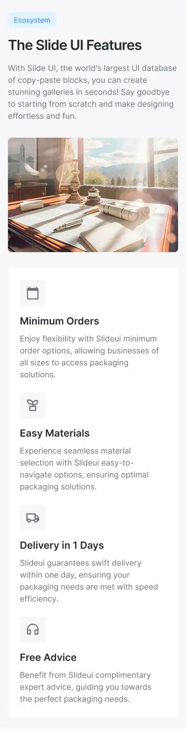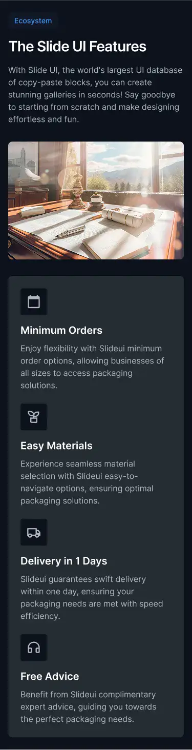 Grid or column-based layouts to highlight your best product features — fast, skimmable, and easy to reuse.