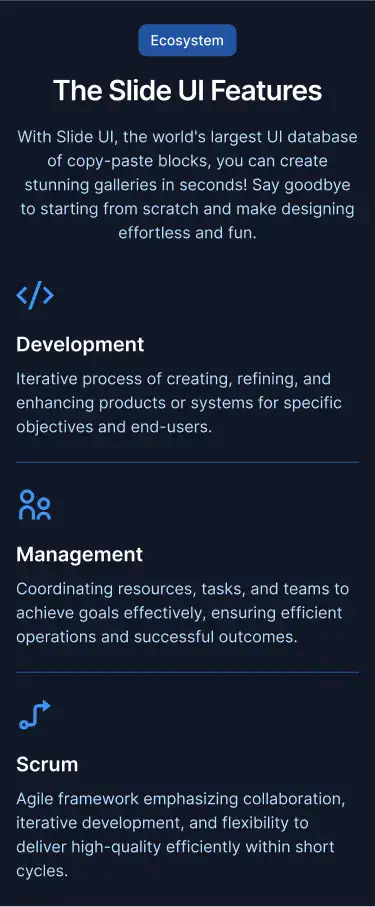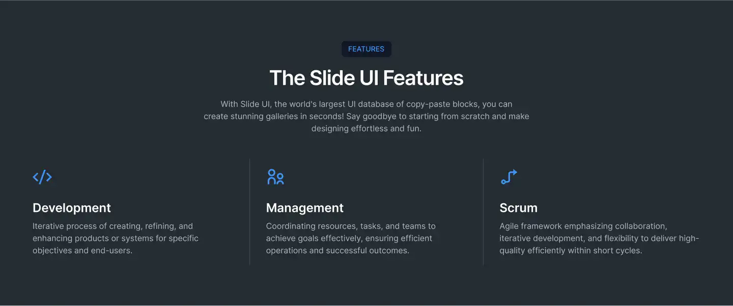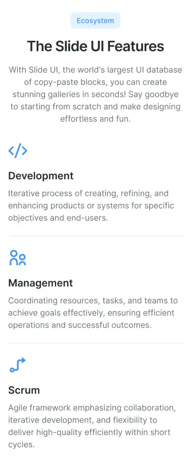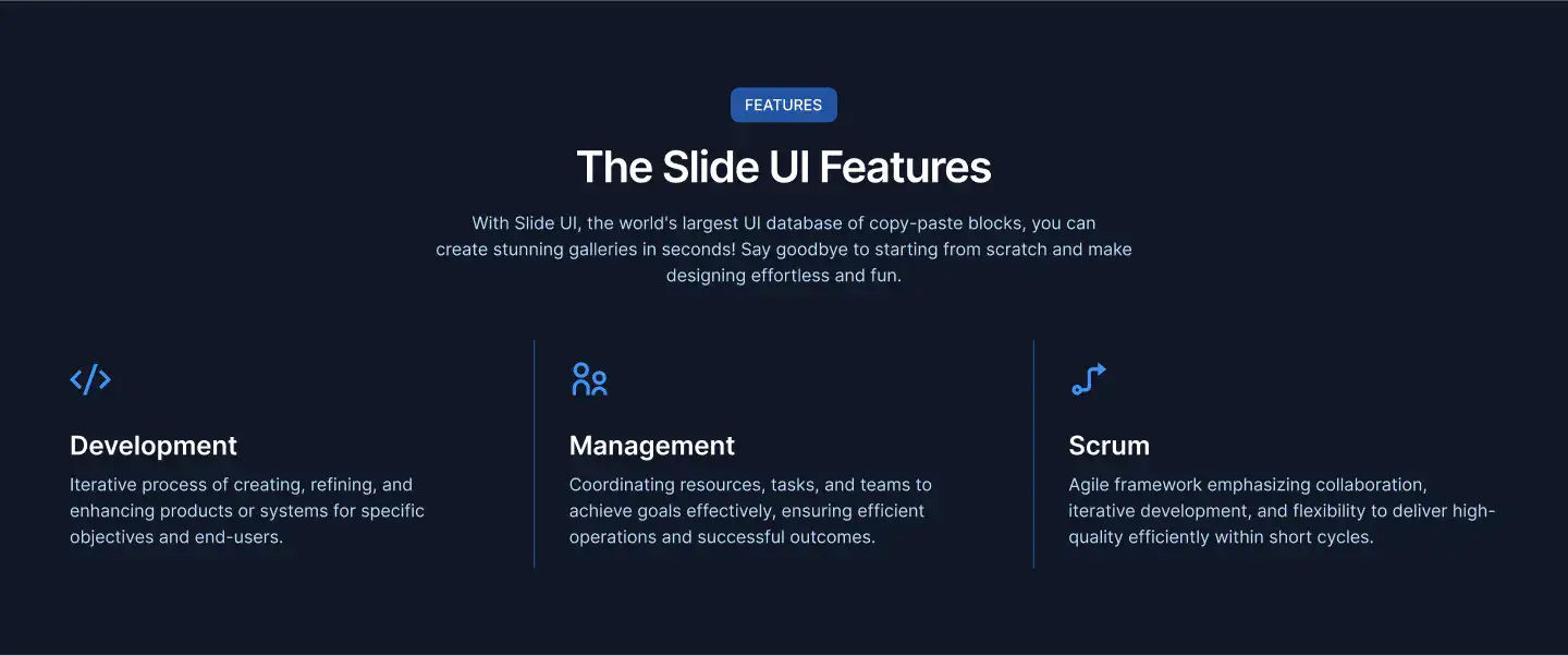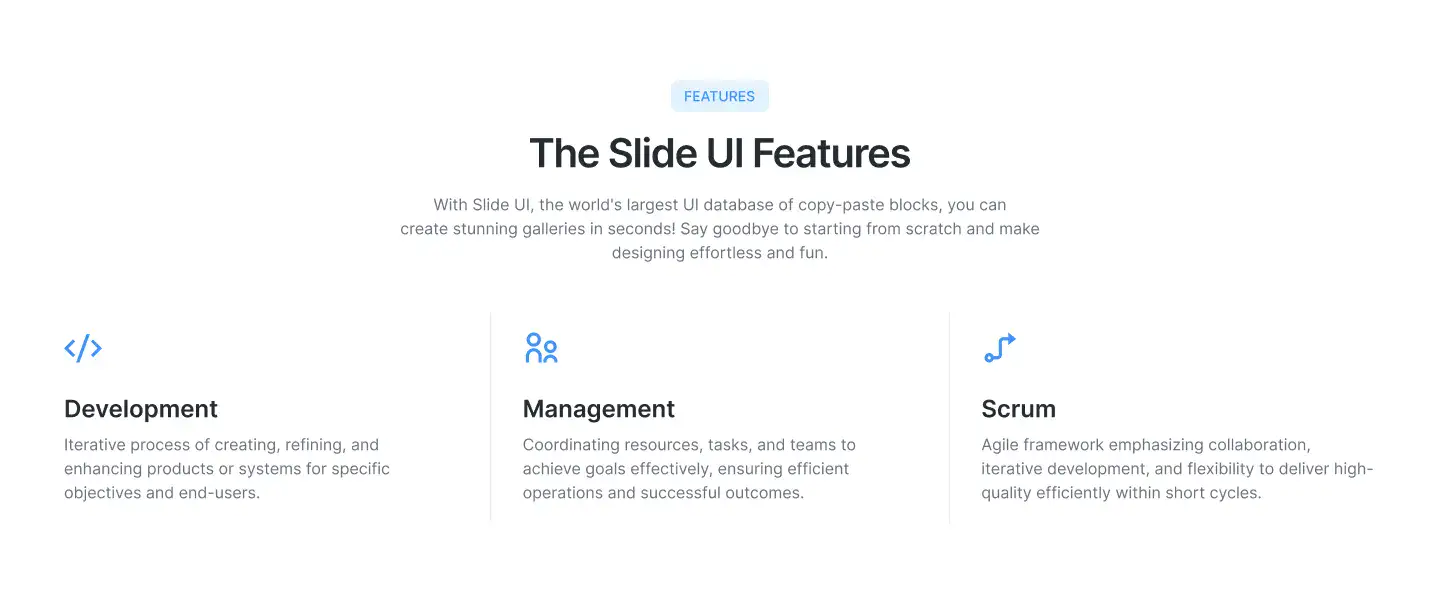 Grid or column-based layouts to highlight your best product features — fast, skimmable, and easy to reuse.