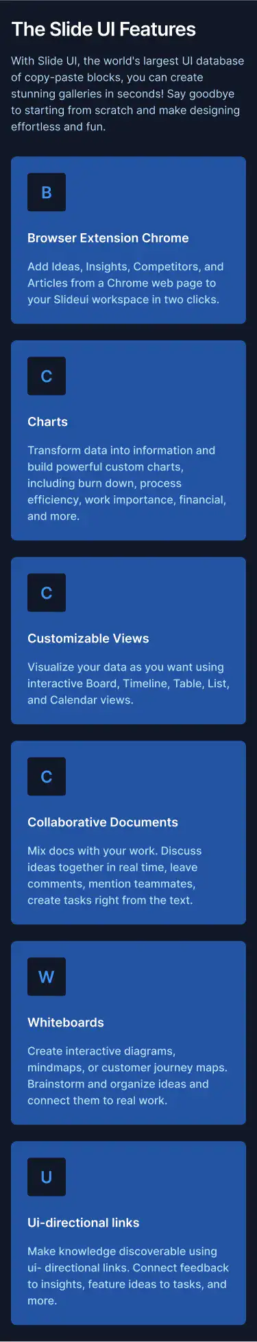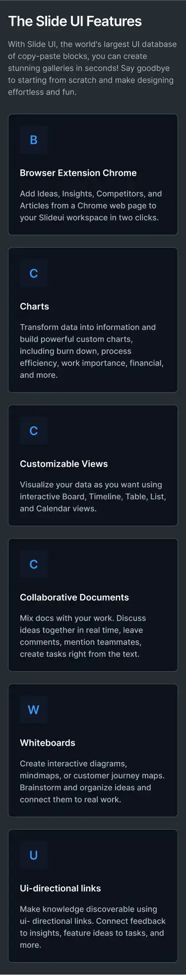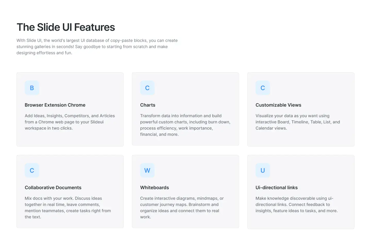 Grid or column-based layouts to highlight your best product features — fast, skimmable, and easy to reuse.