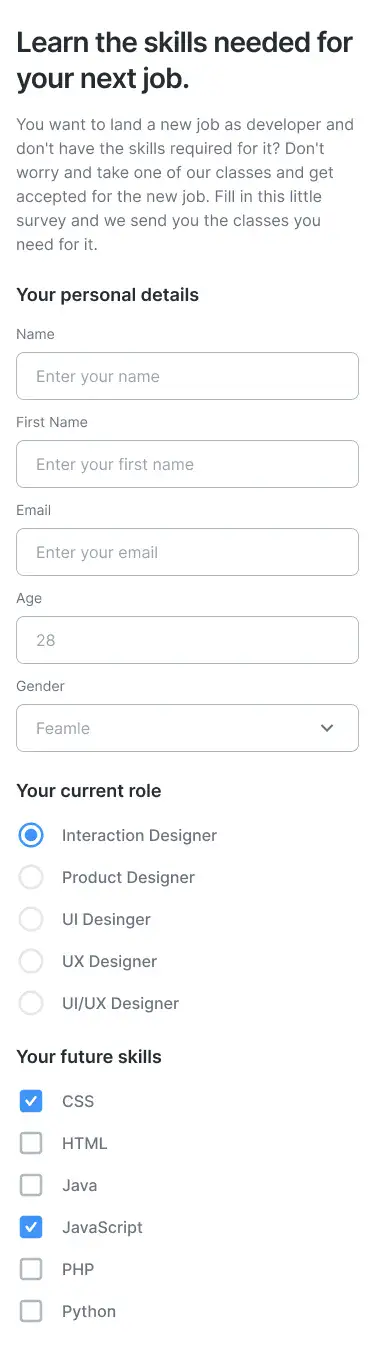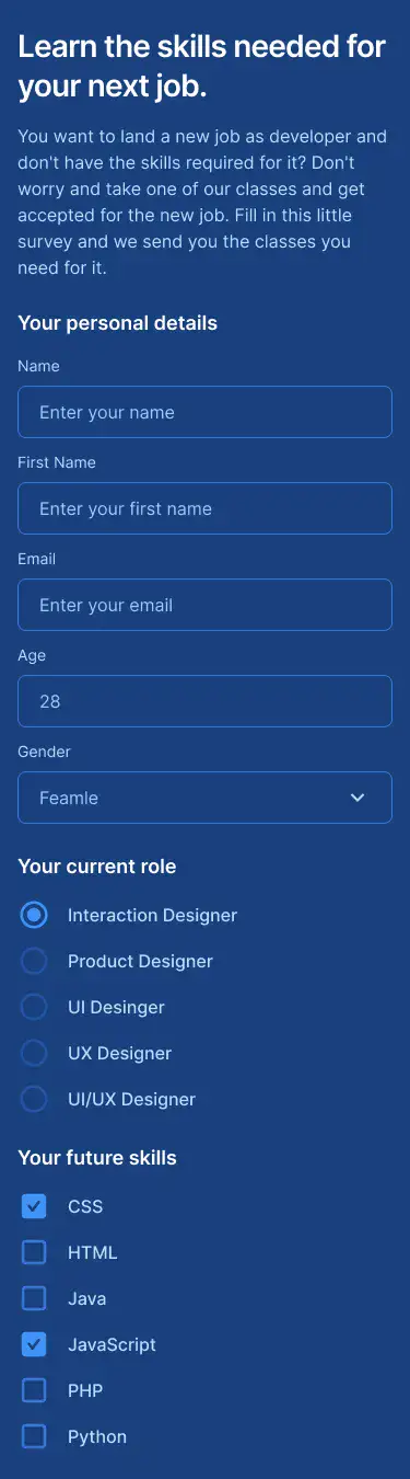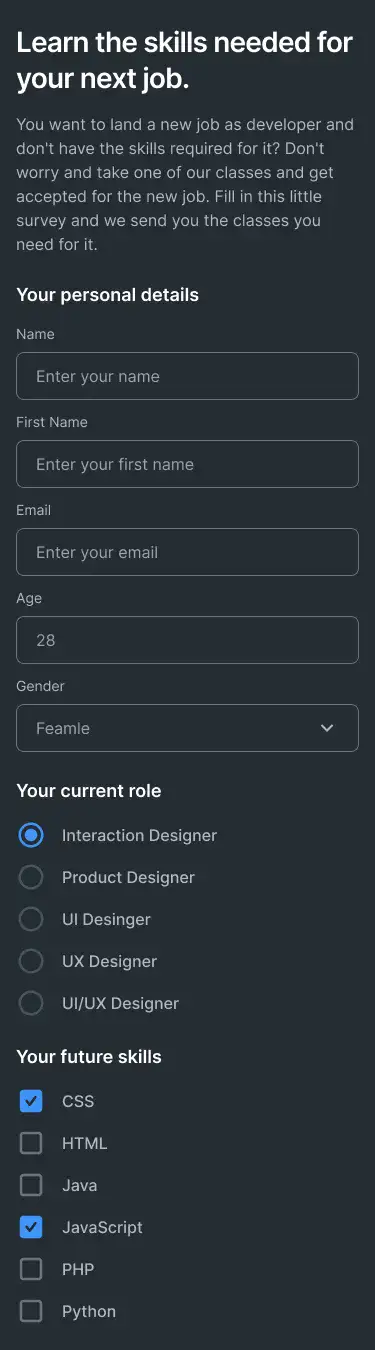 Form Survey Quiz Layout for Figma — modern, themeable and responsive across Desktop, Tablet and Mobile. Includes Light, Dark and Accent modes for fast customisation. Ideal for Crypto, Fitness, Portfolio.
