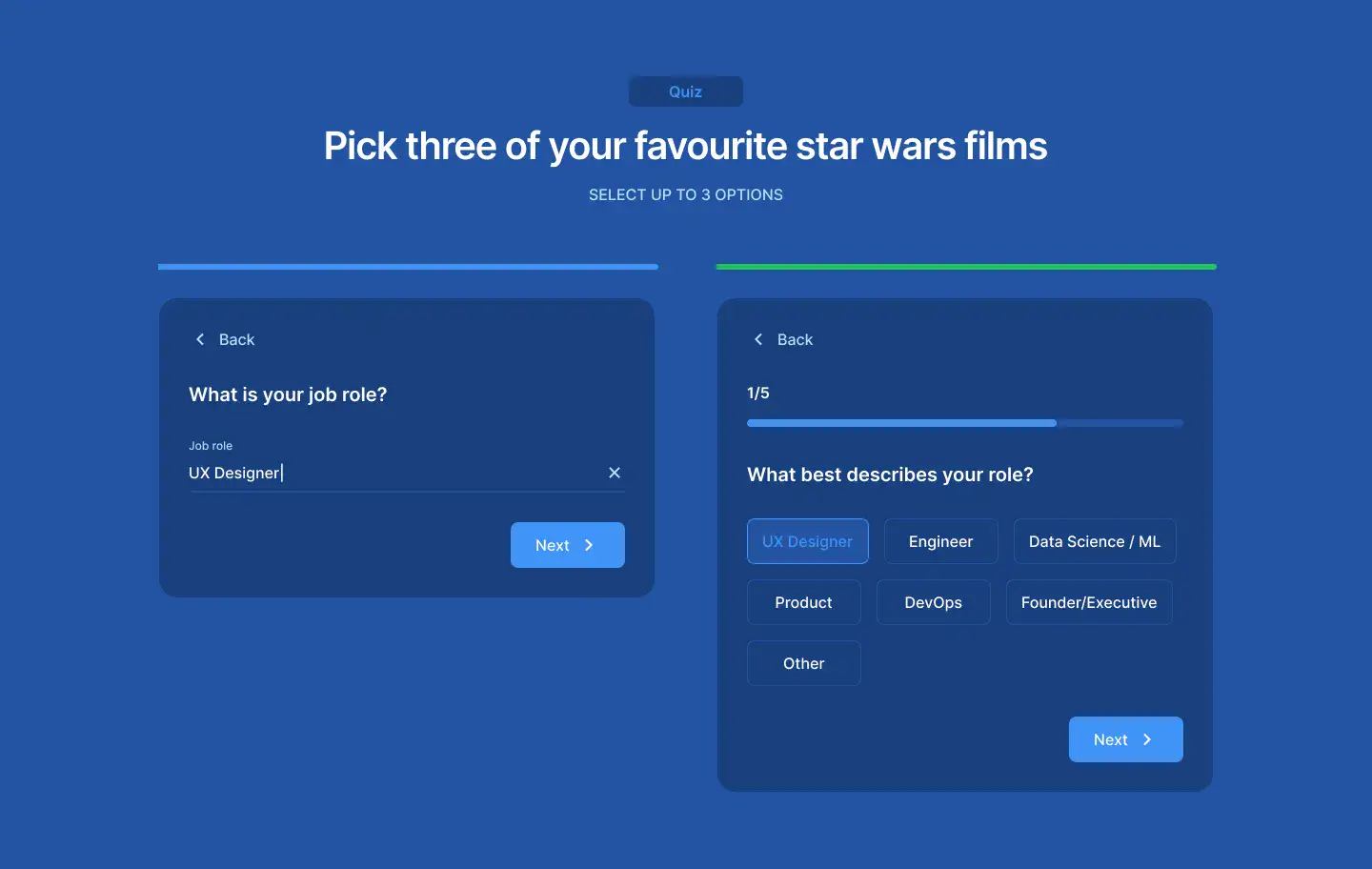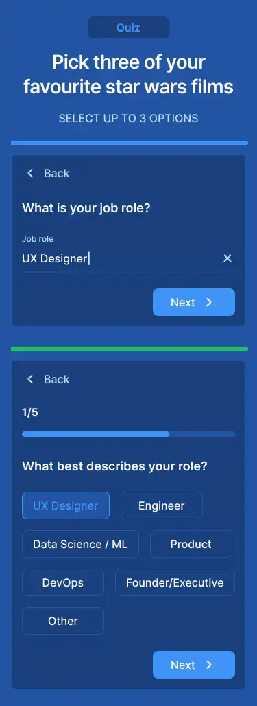 Multi-step flows for onboarding, signups, or product tours. Includes visual progress indicators.