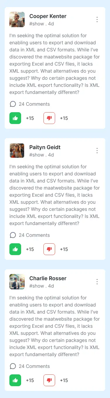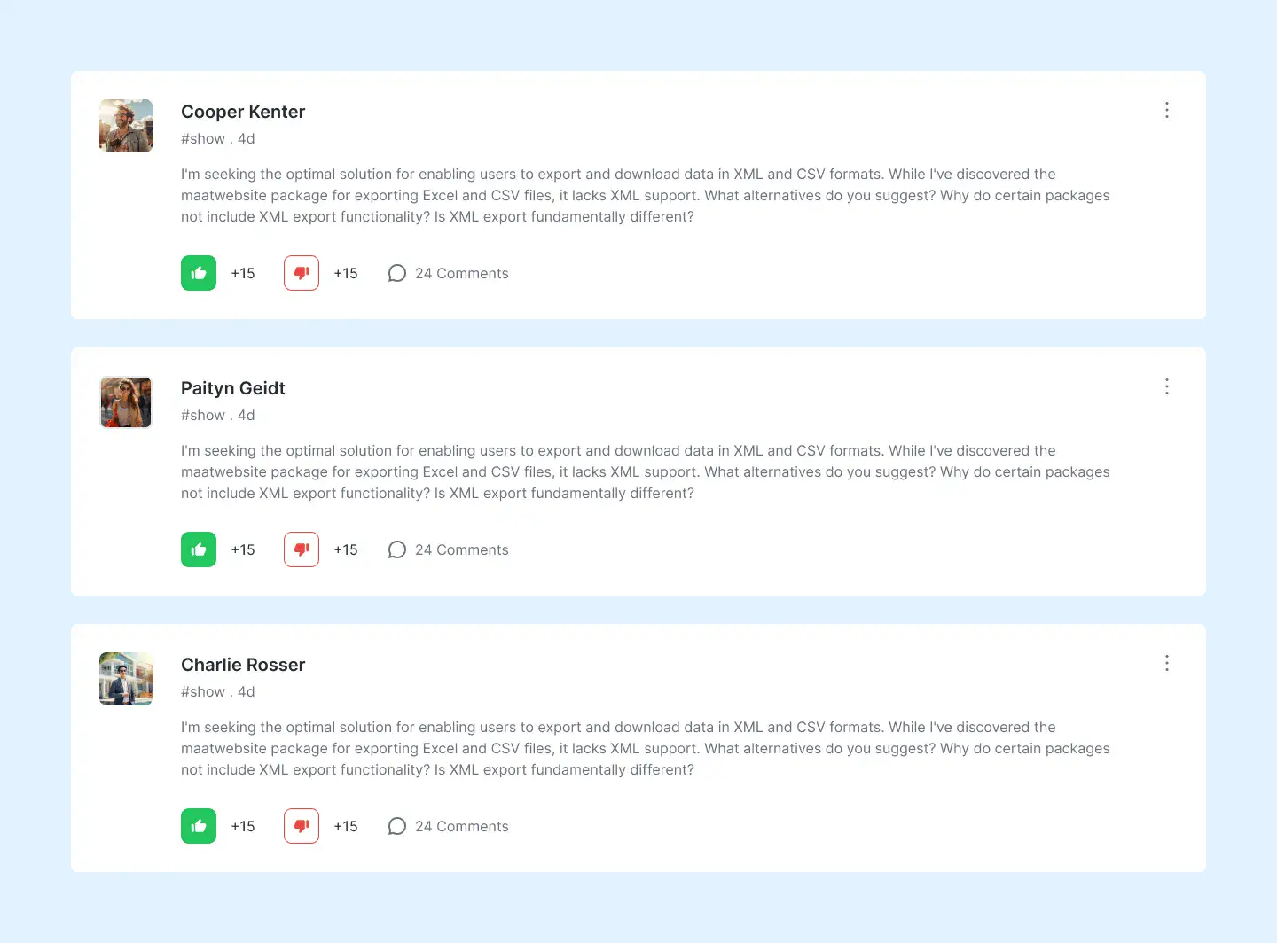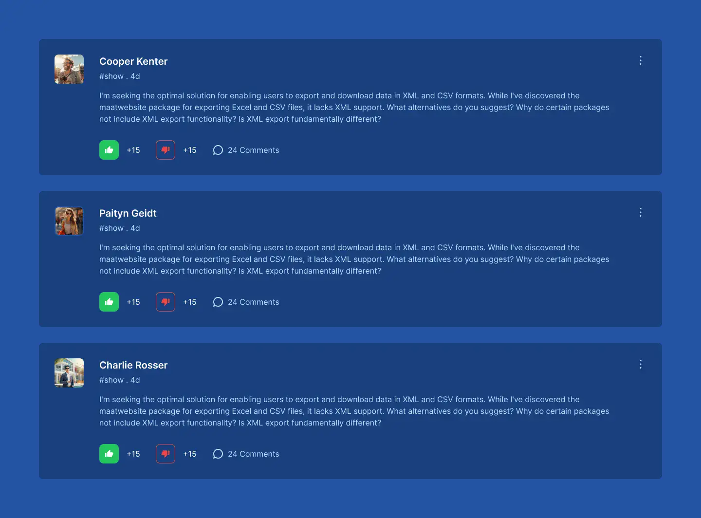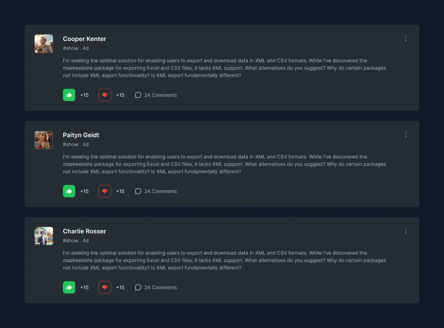 Design community, forum, or support boards with user posts, threads, and activity feeds.