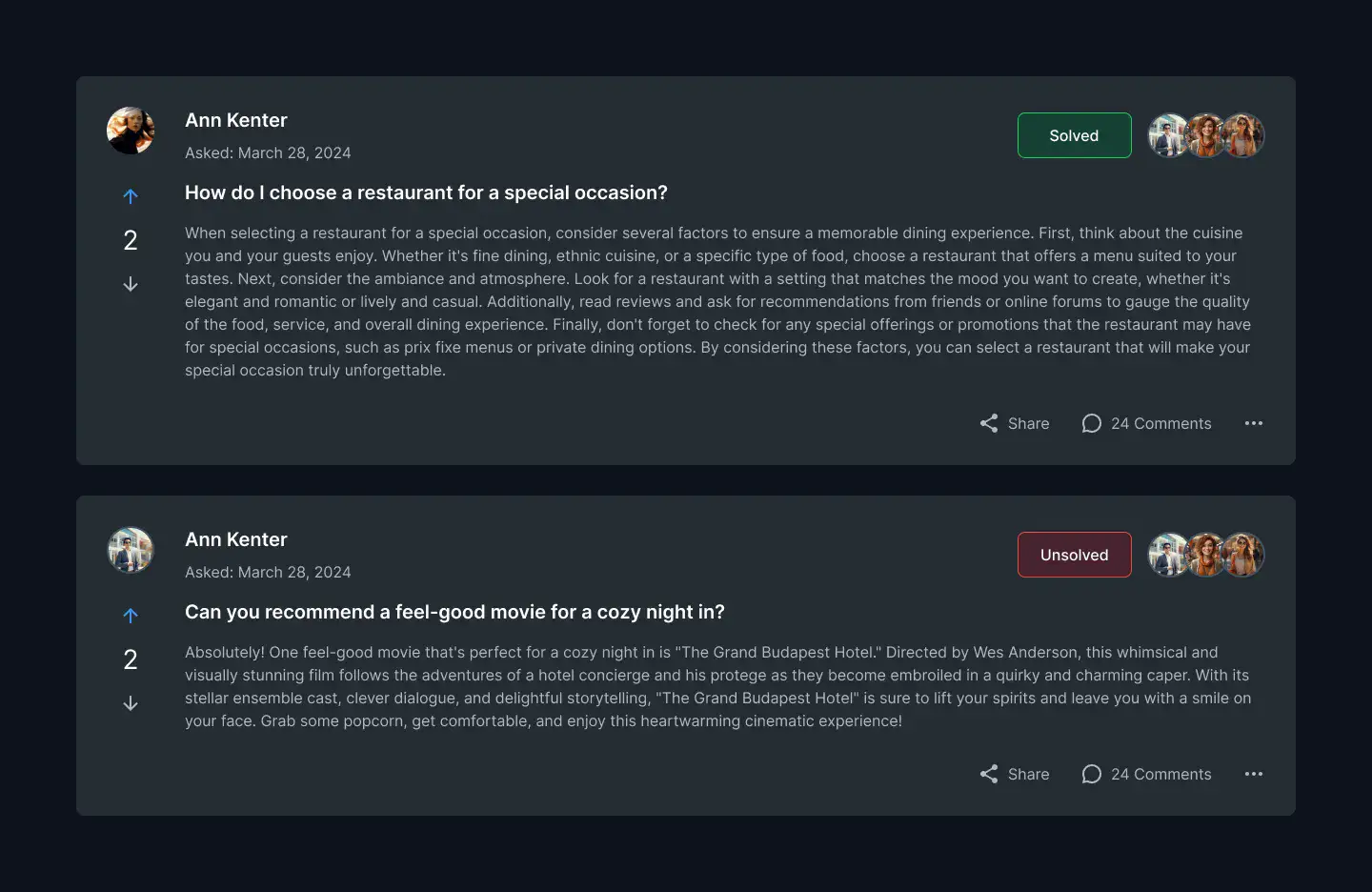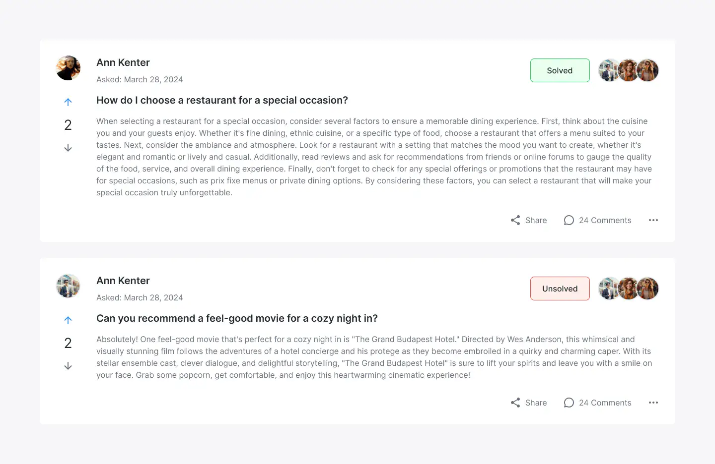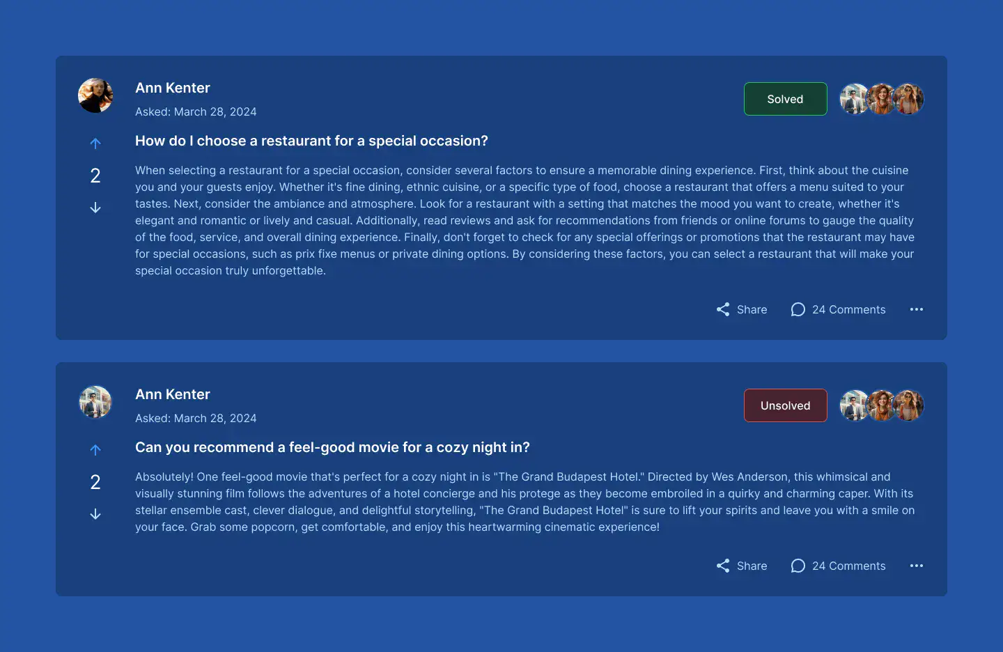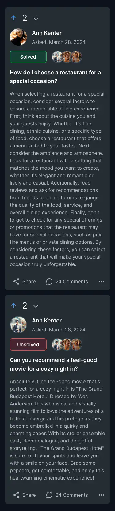 Design community, forum, or support boards with user posts, threads, and activity feeds.