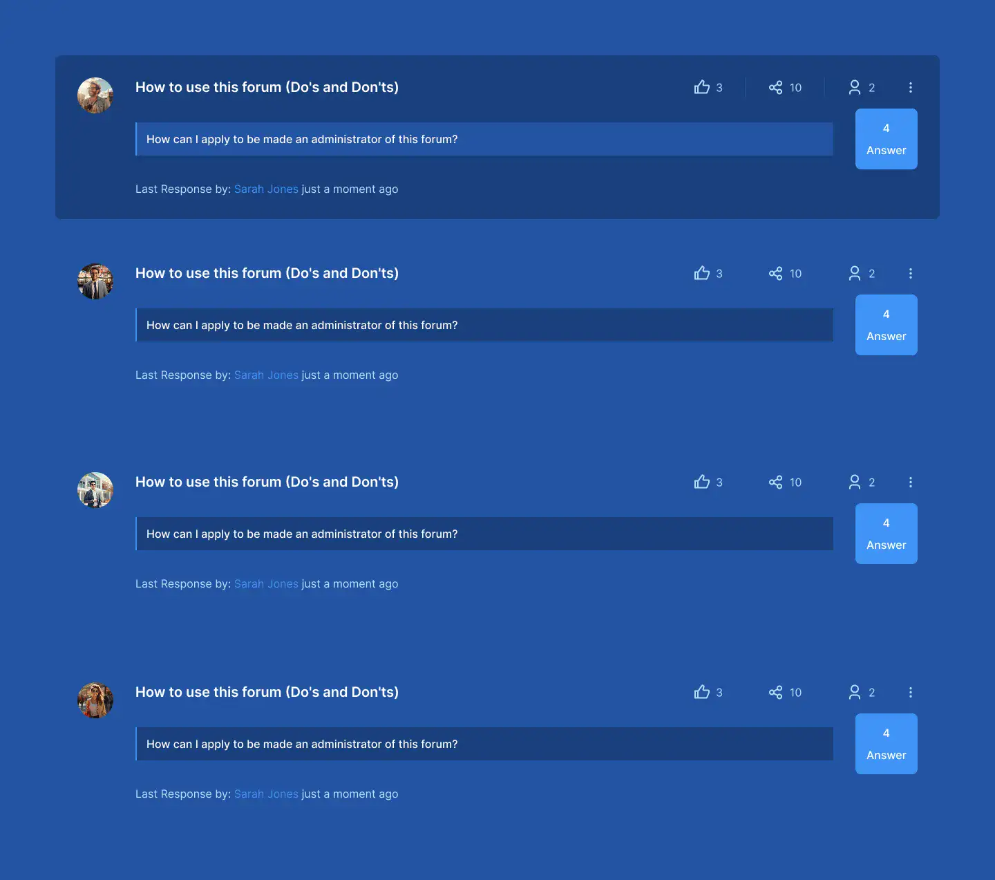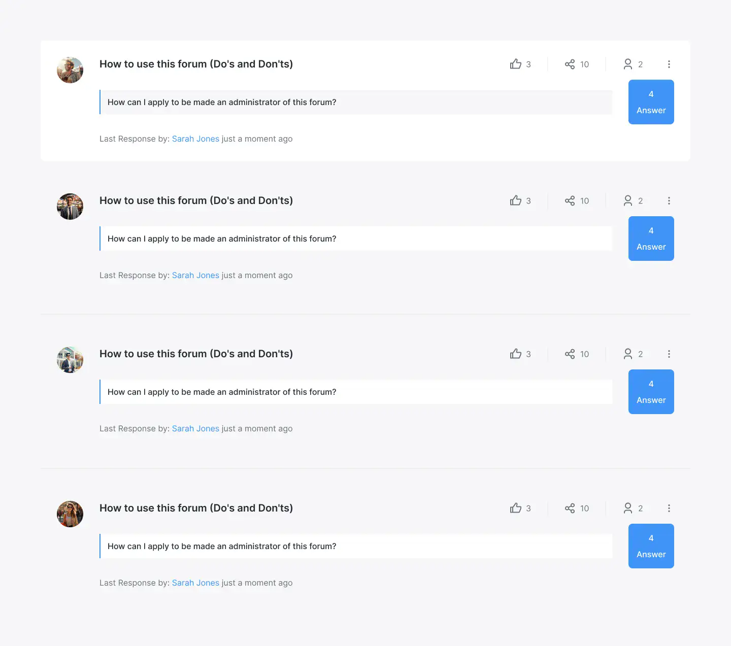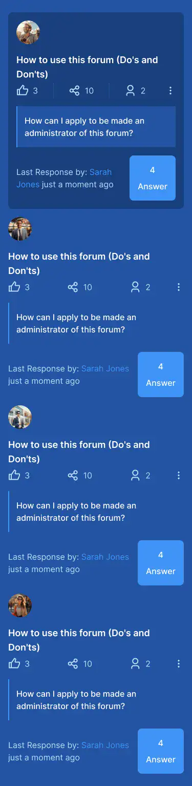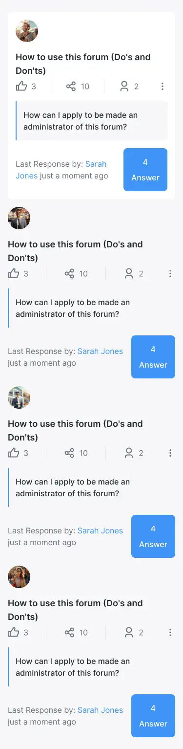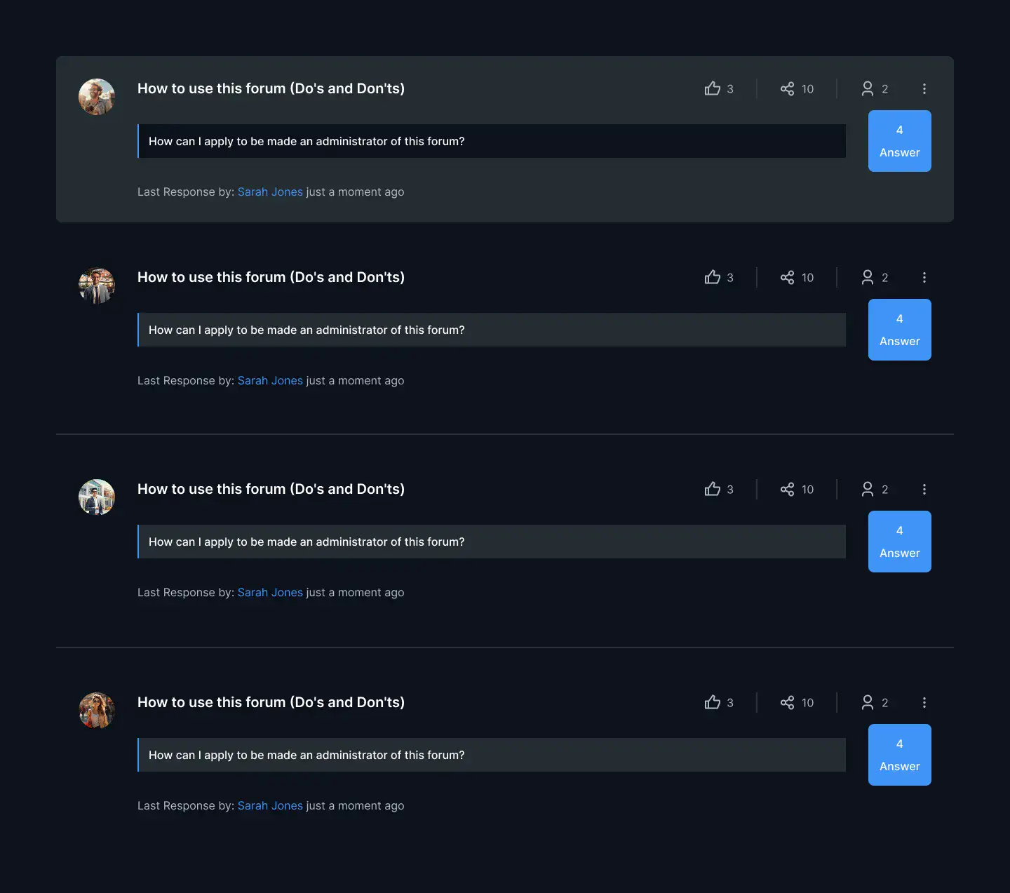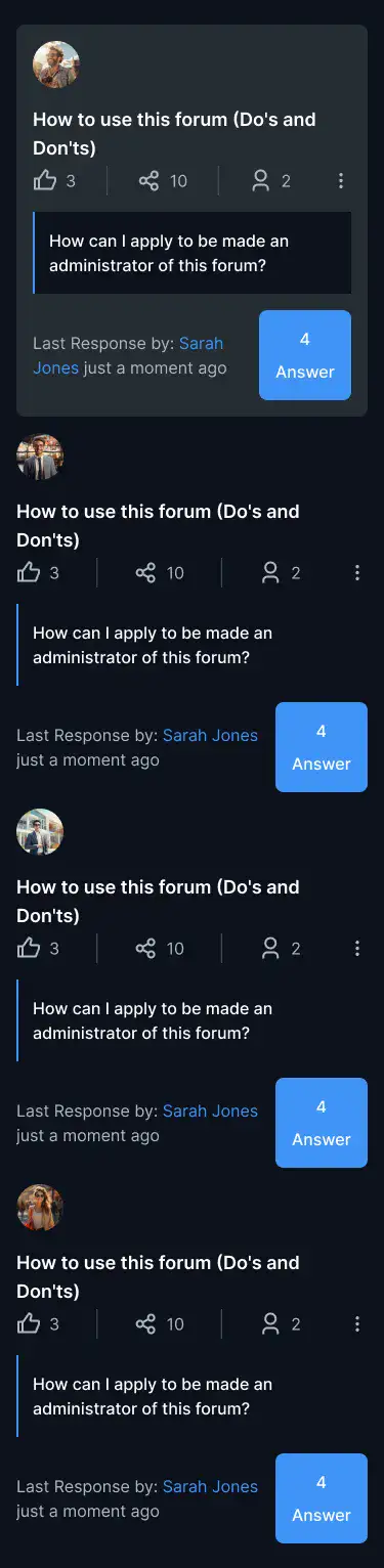 Design community, forum, or support boards with user posts, threads, and activity feeds.