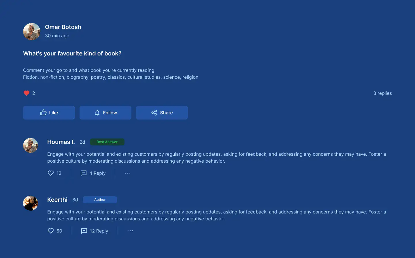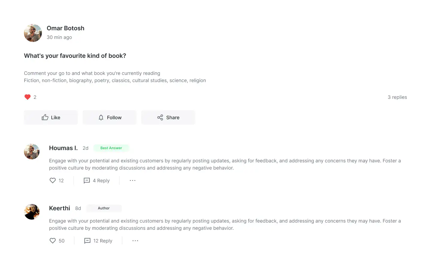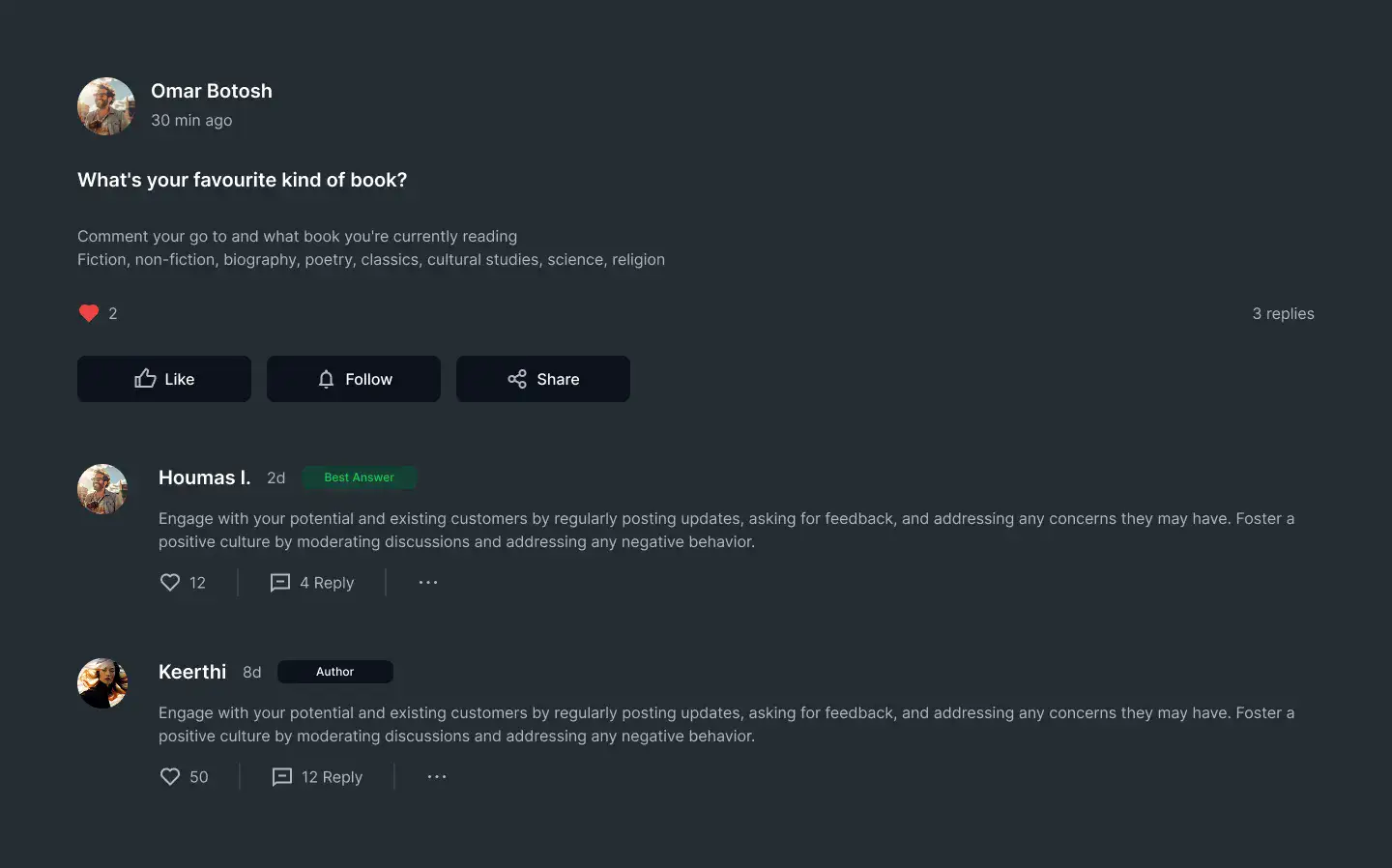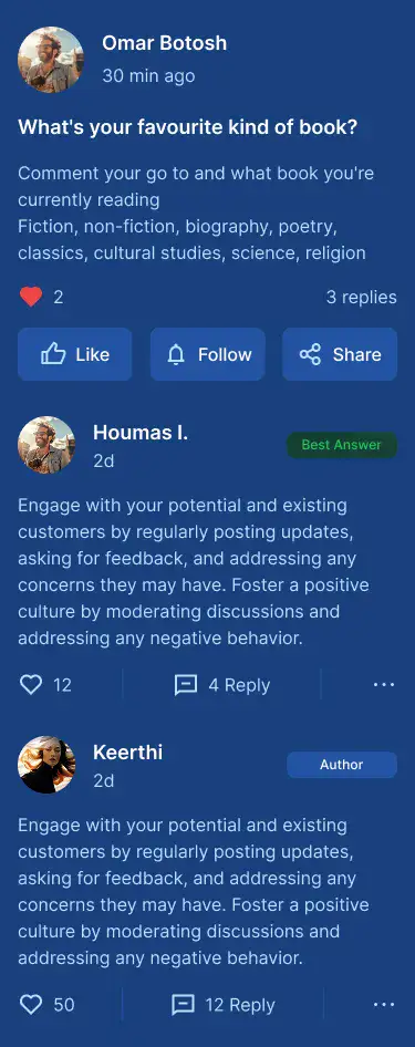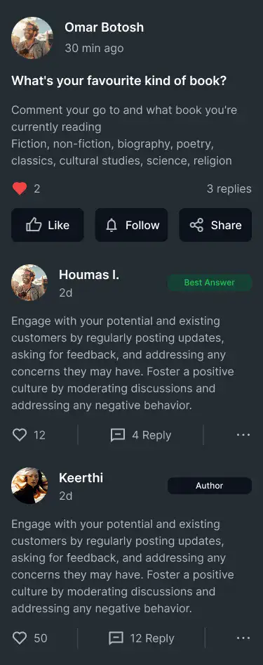 Design community, forum, or support boards with user posts, threads, and activity feeds.