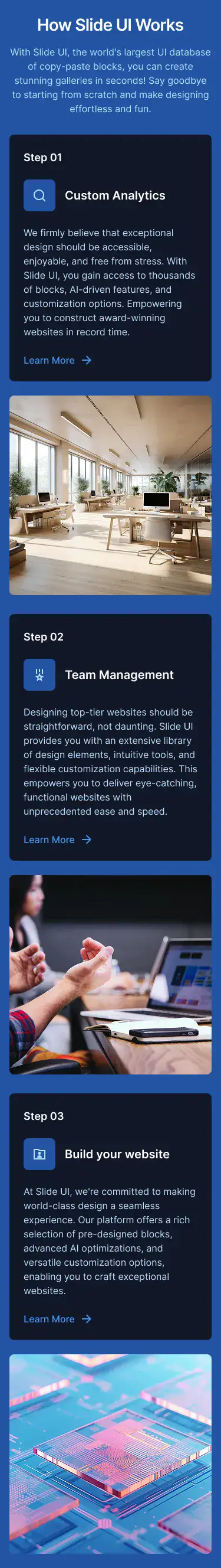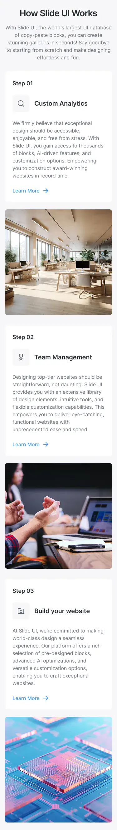 View How It Works blocksHighlight product advantages with icons, metrics, and comparison stats. Designed to build trust and speed up decision-making.
