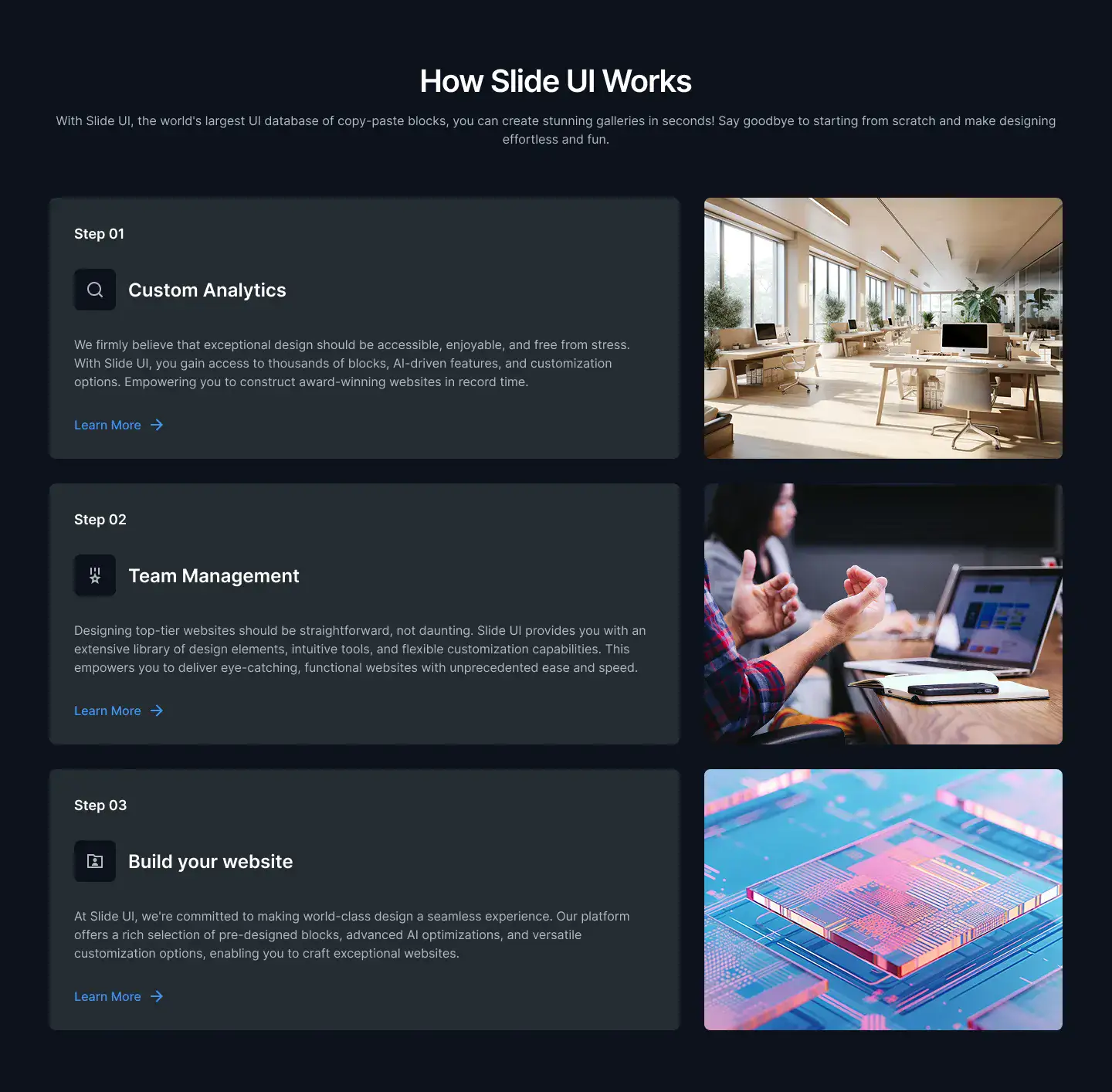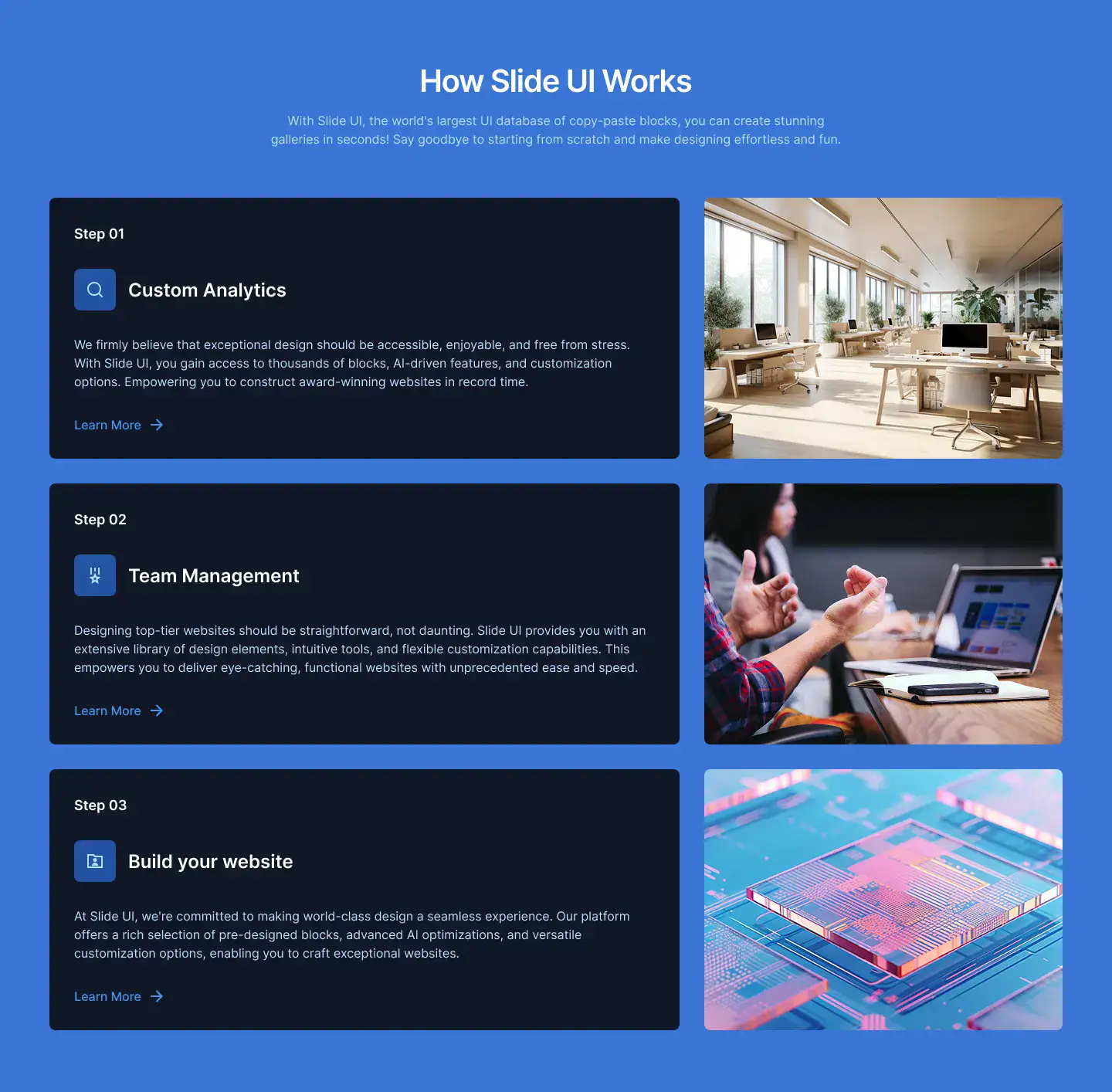 View Hero blocksShowcase processes, features, or onboarding in a clean 3–4 step layout. These are perfect for explaining complex ideas simply.