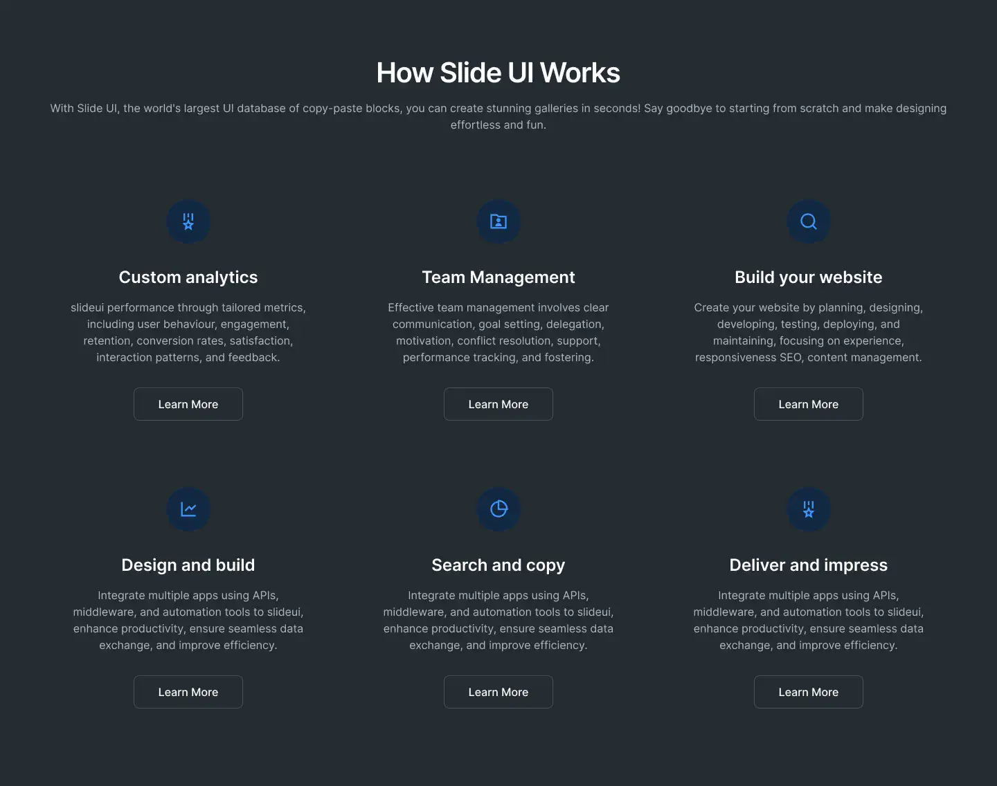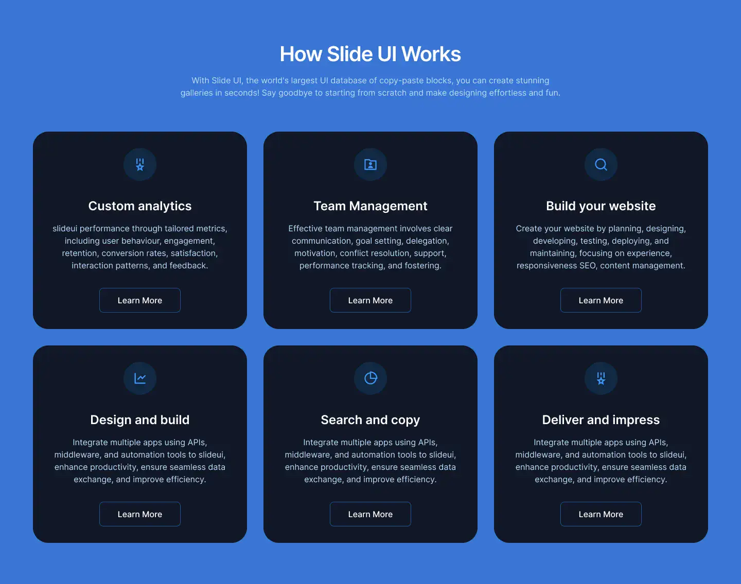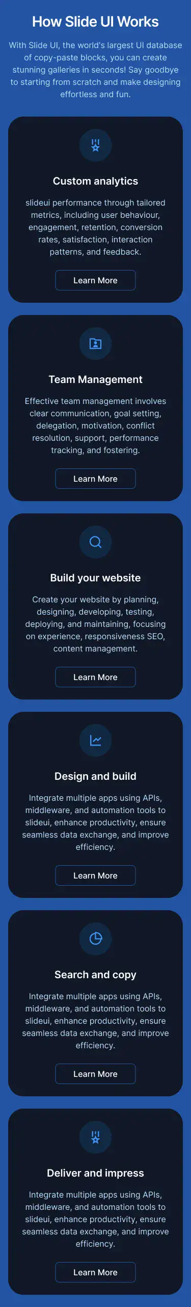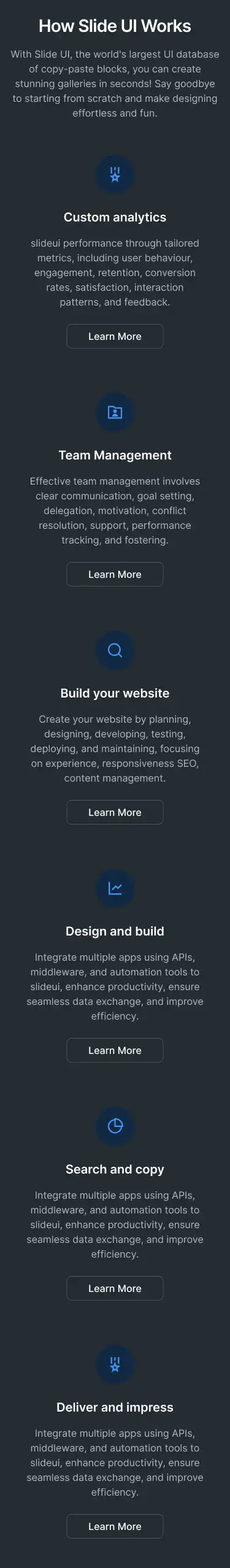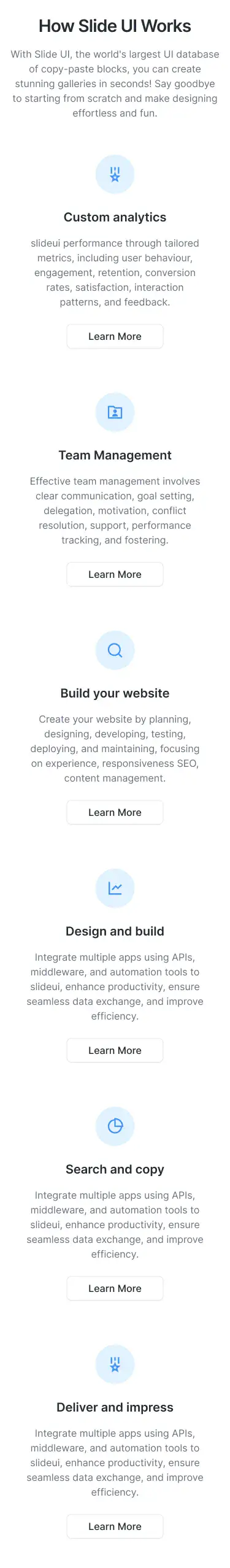 View How It Works blocksHighlight product advantages with icons, metrics, and comparison stats. Designed to build trust and speed up decision-making.