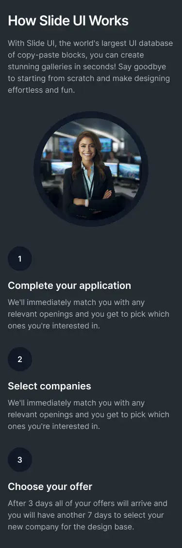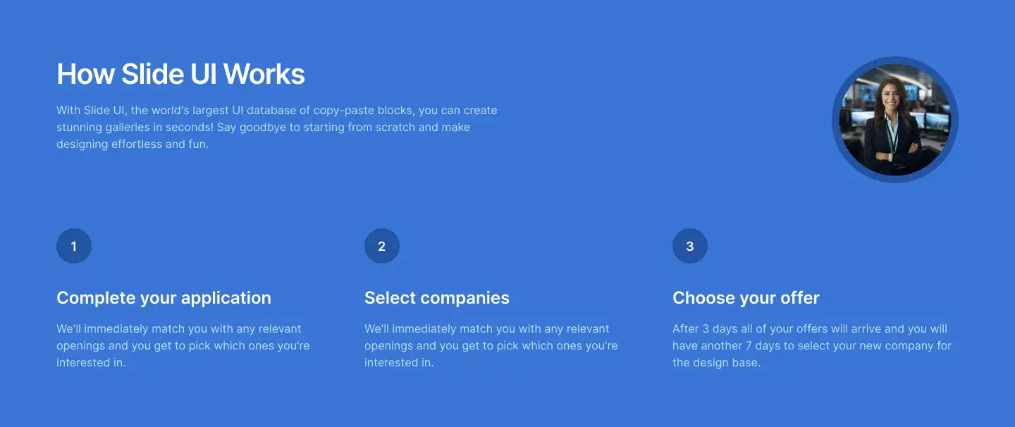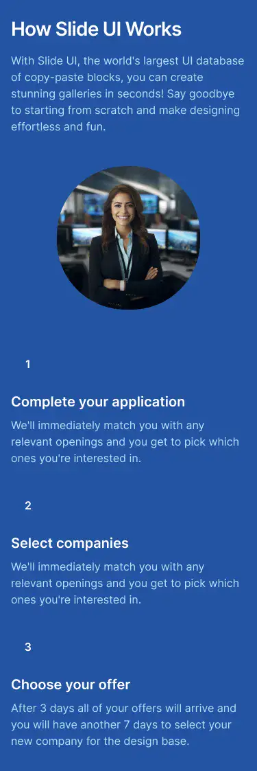 View Hero blocksShowcase processes, features, or onboarding in a clean 3–4 step layout. These are perfect for explaining complex ideas simply.