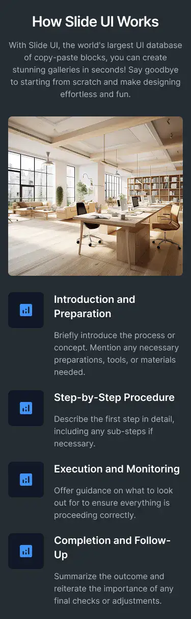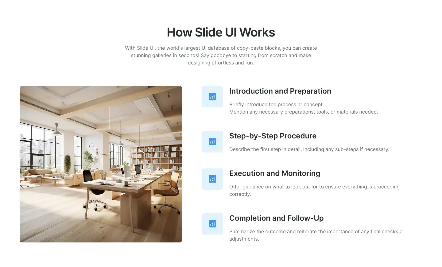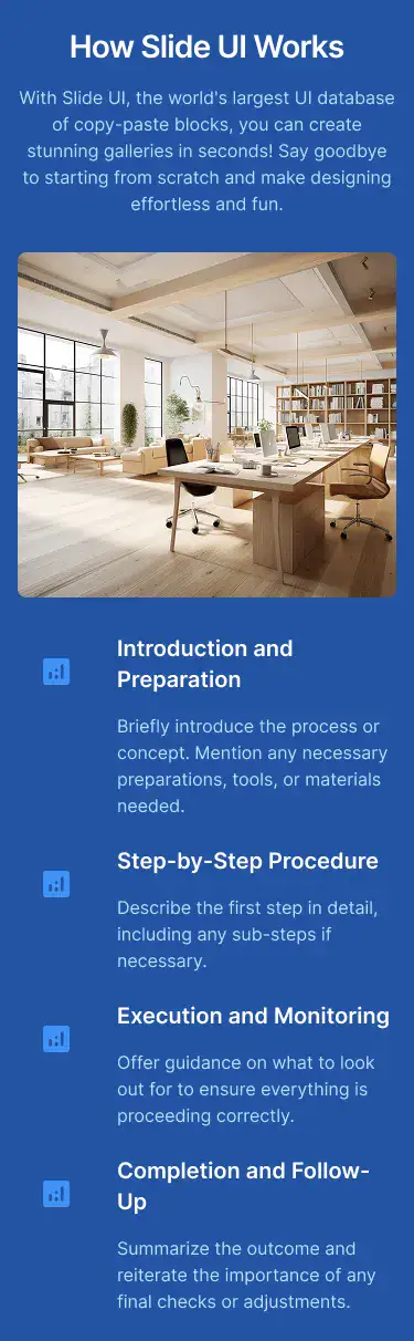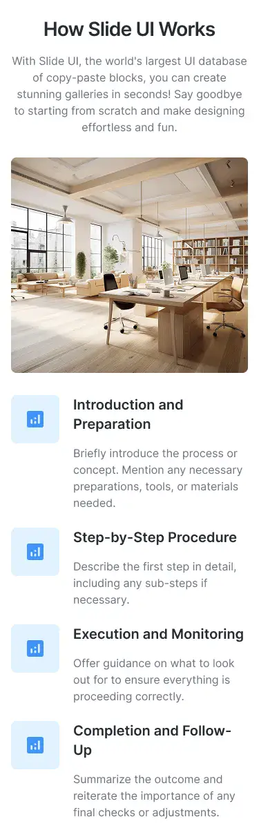 View How It Works blocksHighlight product advantages with icons, metrics, and comparison stats. Designed to build trust and speed up decision-making.