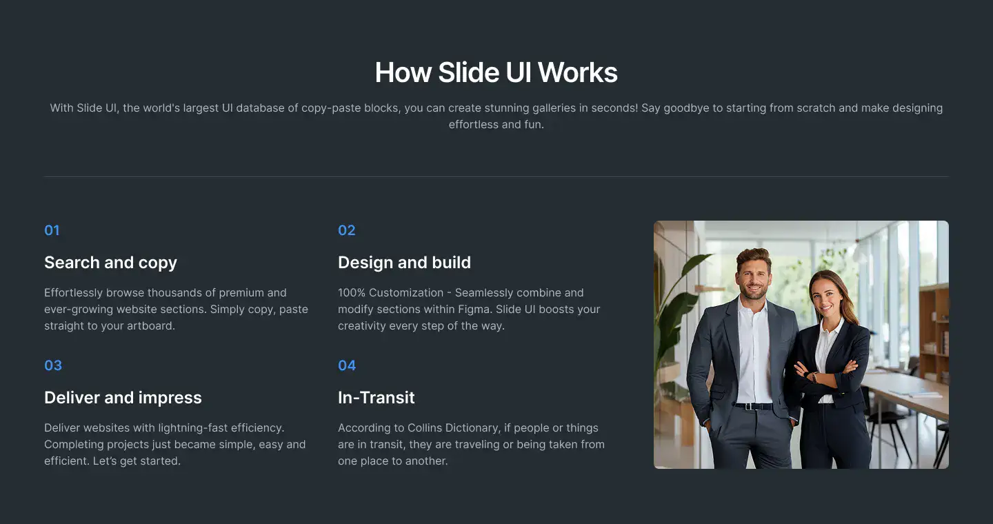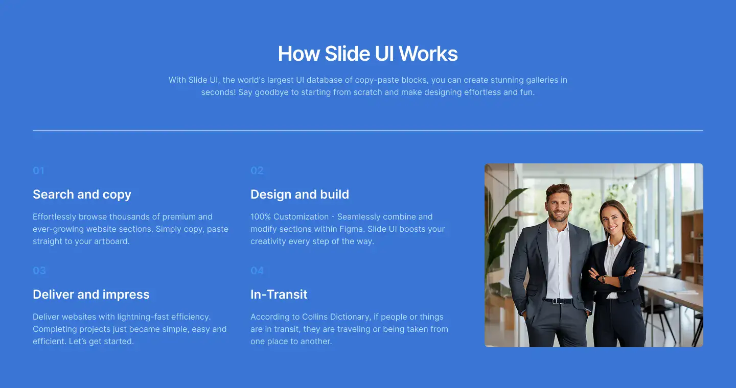 View Hero blocksShowcase processes, features, or onboarding in a clean 3–4 step layout. These are perfect for explaining complex ideas simply.