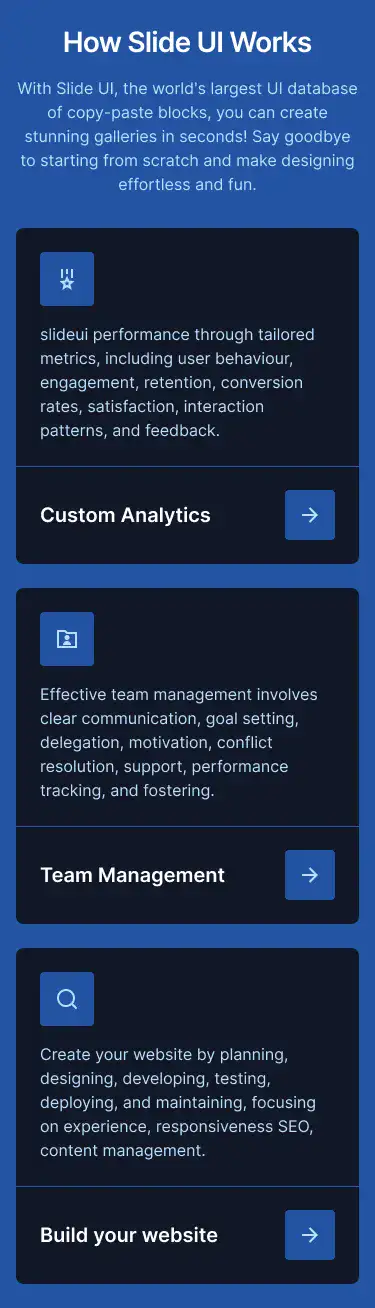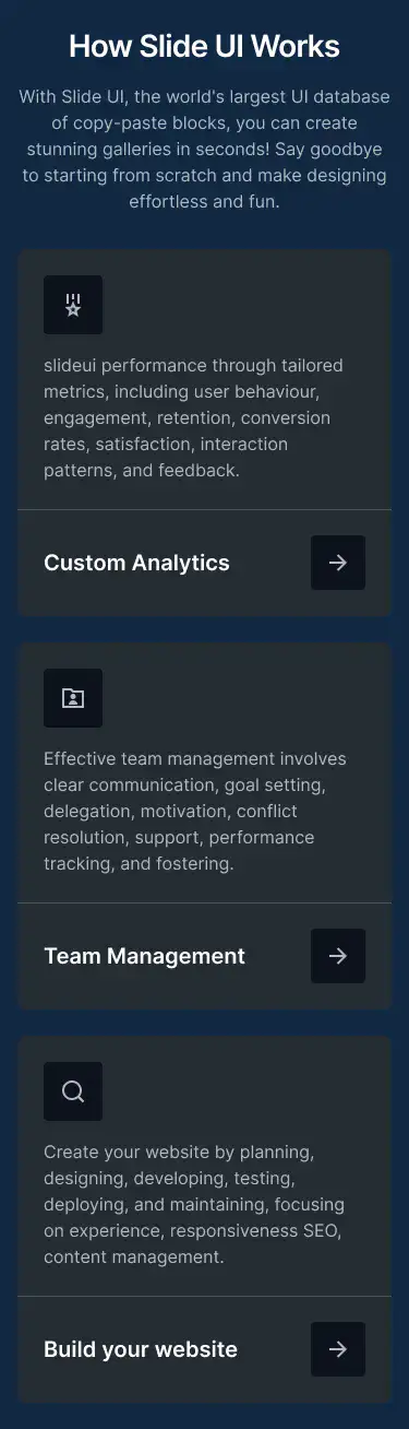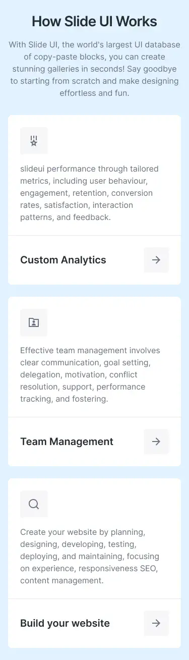 Grid or column-based layouts to highlight your best product features — fast, skimmable, and easy to reuse.