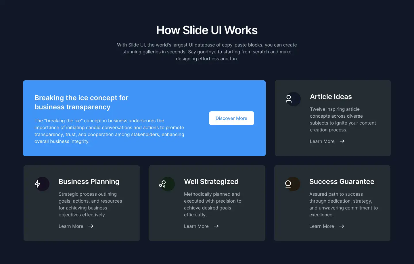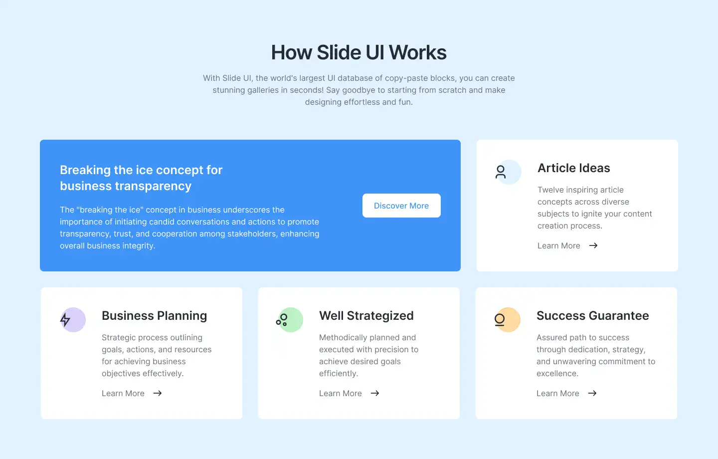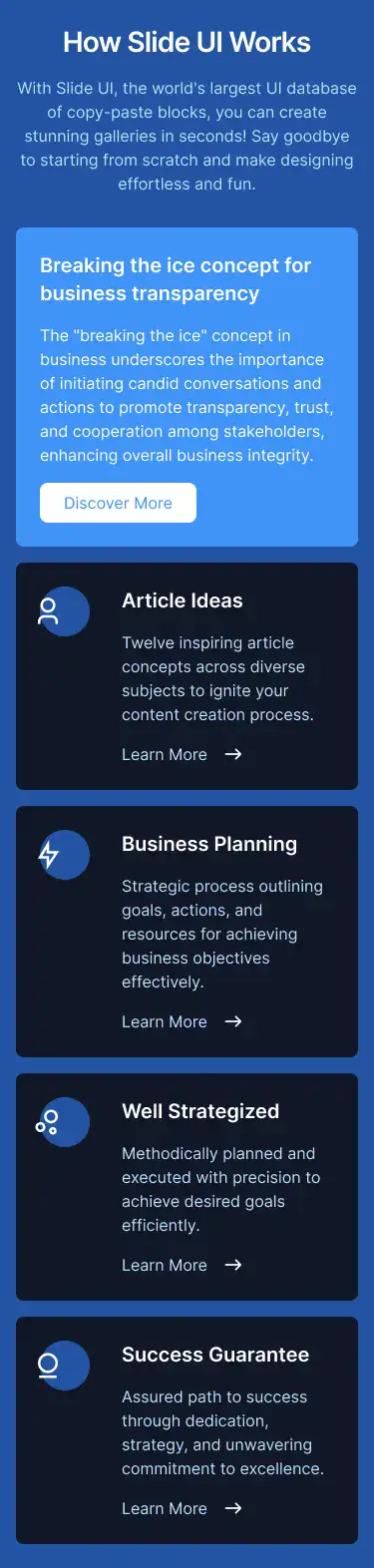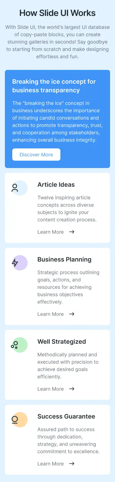 View How It Works blocksHighlight product advantages with icons, metrics, and comparison stats. Designed to build trust and speed up decision-making.