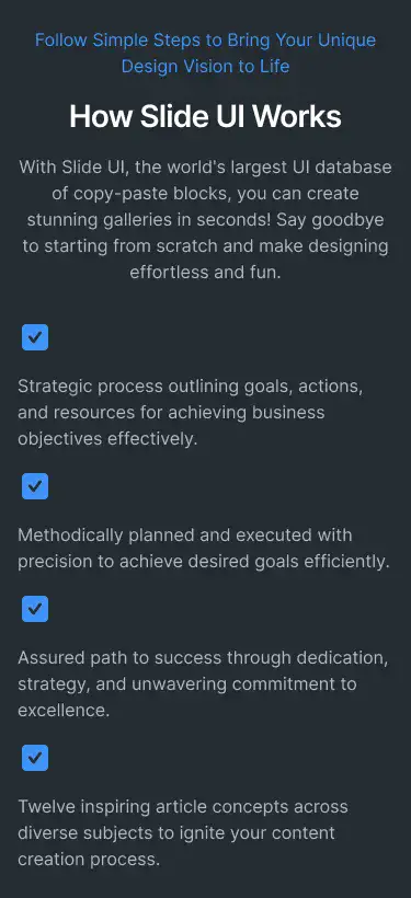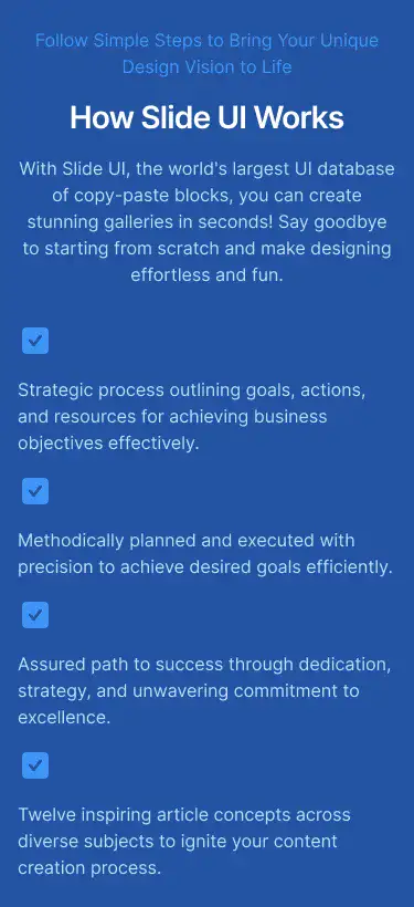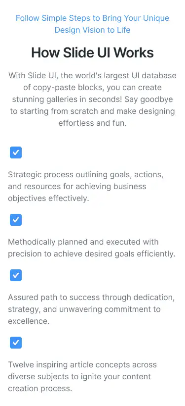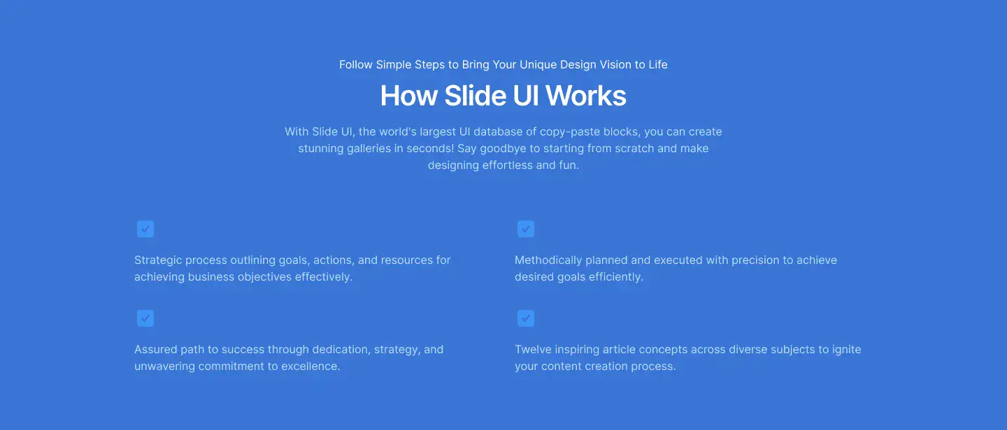 View How It Works blocksHighlight product advantages with icons, metrics, and comparison stats. Designed to build trust and speed up decision-making.