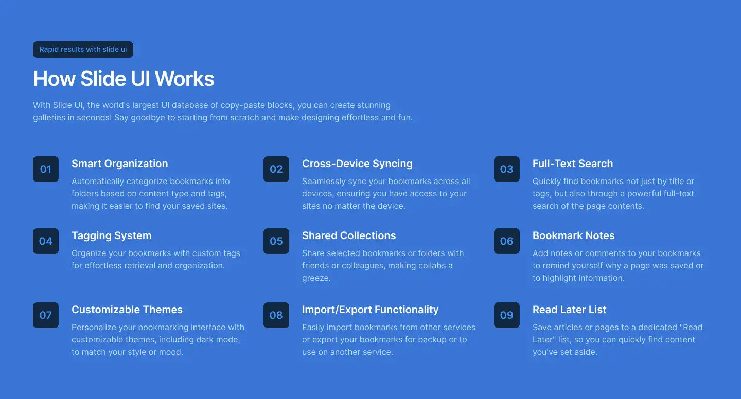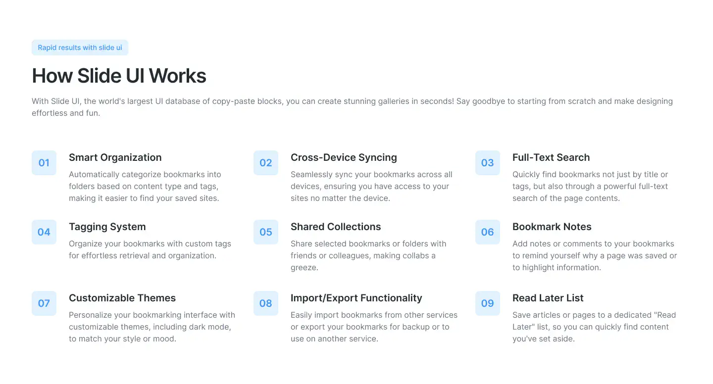 Grid or column-based layouts to highlight your best product features — fast, skimmable, and easy to reuse.