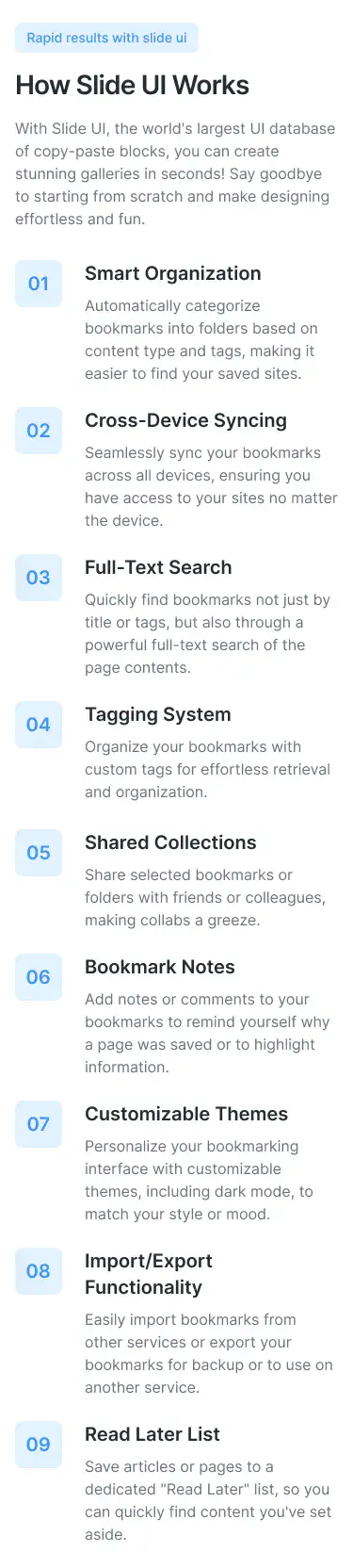 View How It Works blocksHighlight product advantages with icons, metrics, and comparison stats. Designed to build trust and speed up decision-making.