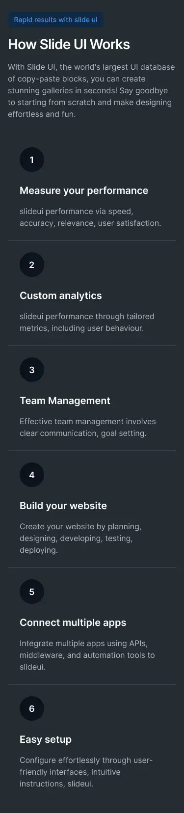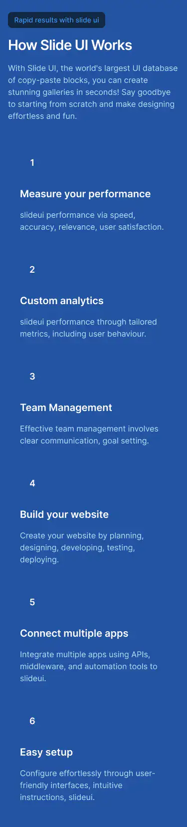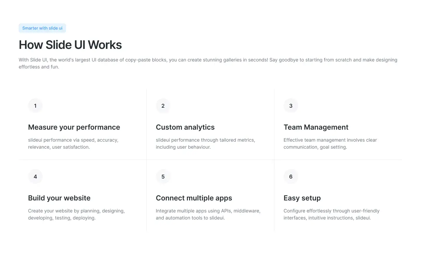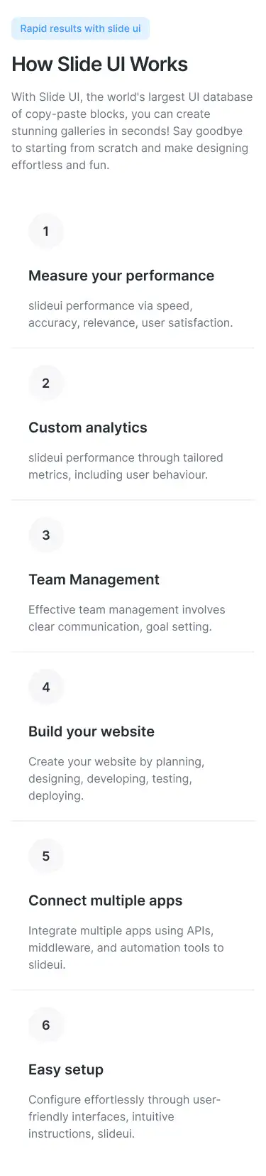 View How It Works blocksHighlight product advantages with icons, metrics, and comparison stats. Designed to build trust and speed up decision-making.