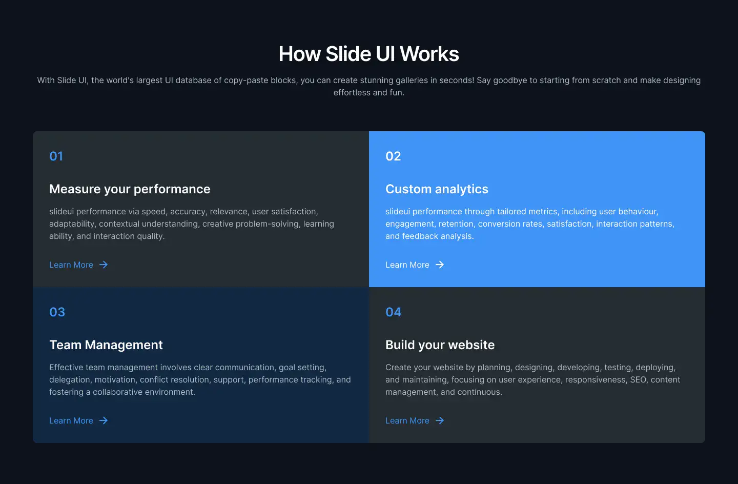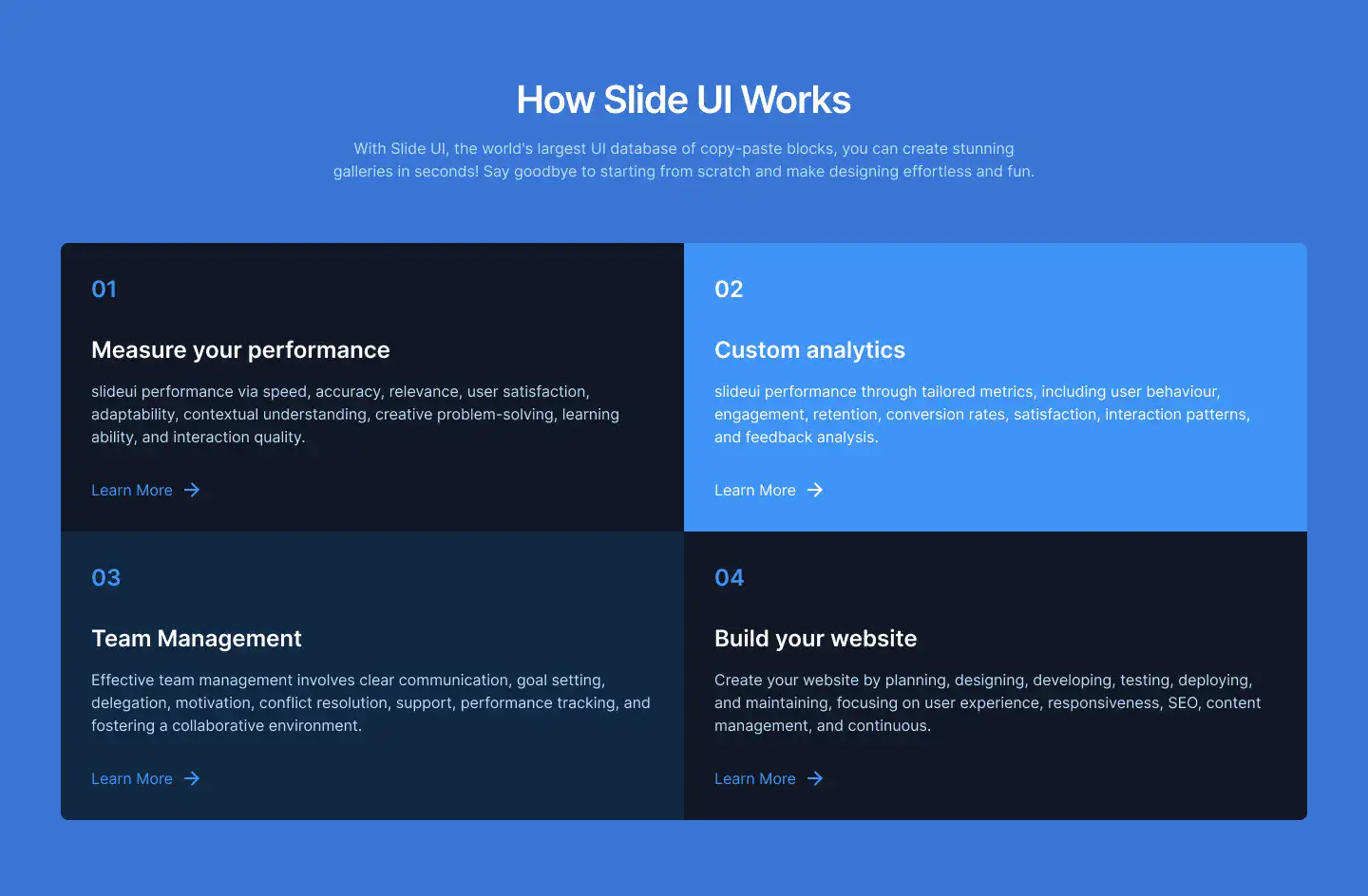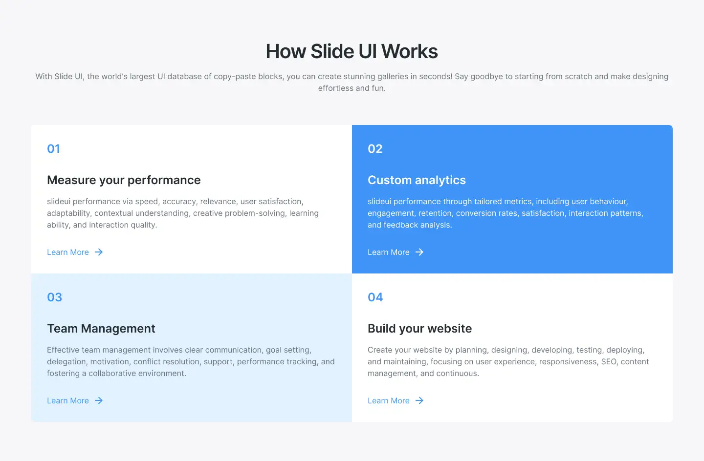 Grid or column-based layouts to highlight your best product features — fast, skimmable, and easy to reuse.