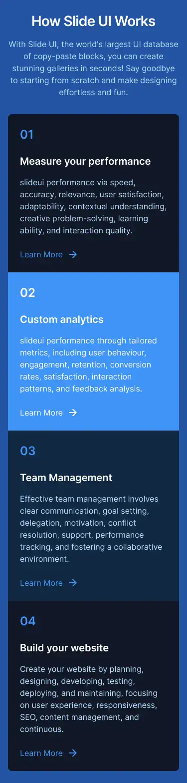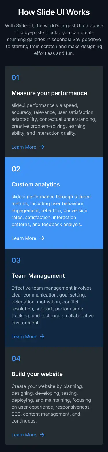 View Hero blocksShowcase processes, features, or onboarding in a clean 3–4 step layout. These are perfect for explaining complex ideas simply.