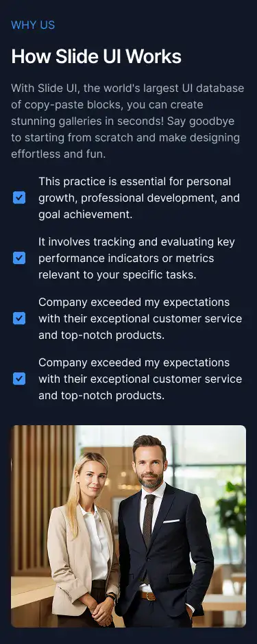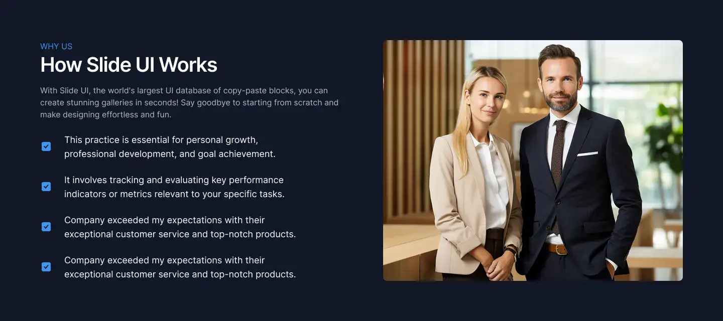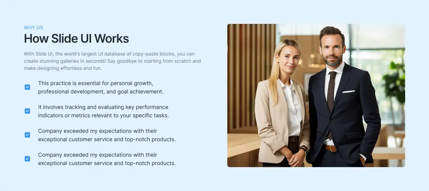 View Hero blocksShowcase processes, features, or onboarding in a clean 3–4 step layout. These are perfect for explaining complex ideas simply.