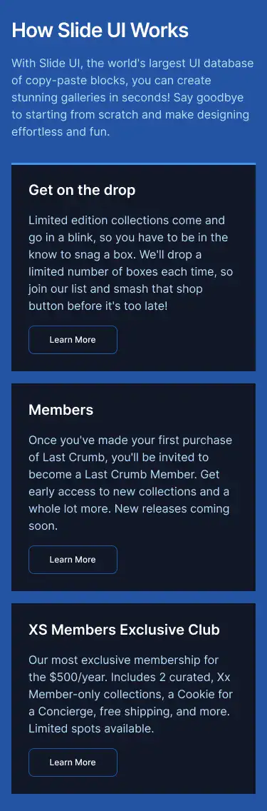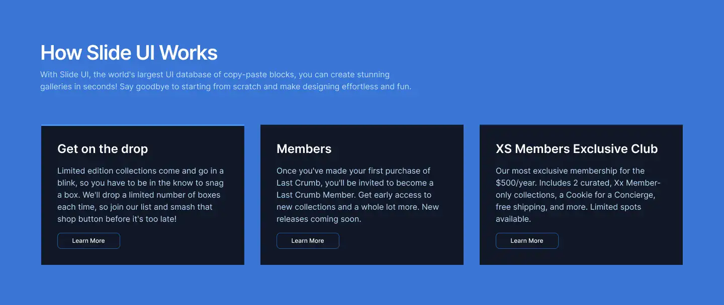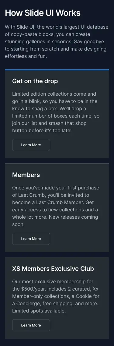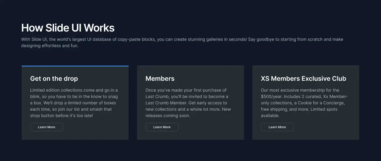 Grid or column-based layouts to highlight your best product features — fast, skimmable, and easy to reuse.