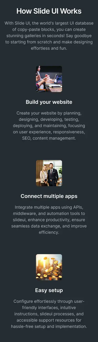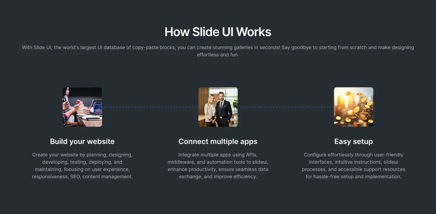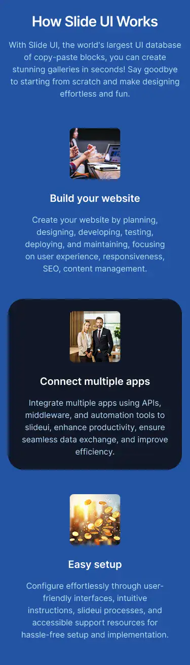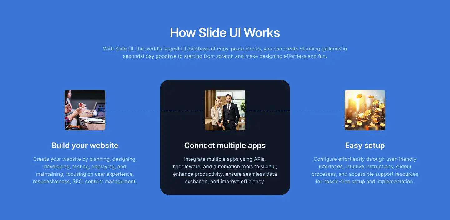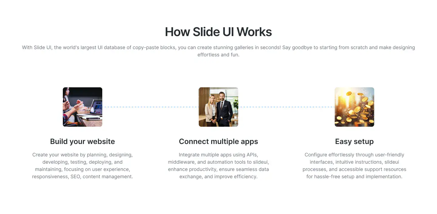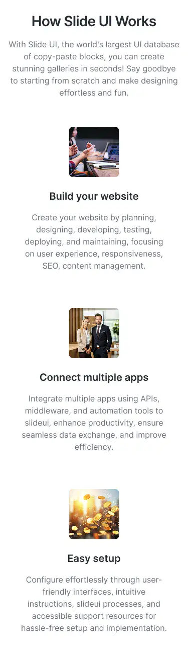 View Hero blocksShowcase processes, features, or onboarding in a clean 3–4 step layout. These are perfect for explaining complex ideas simply.