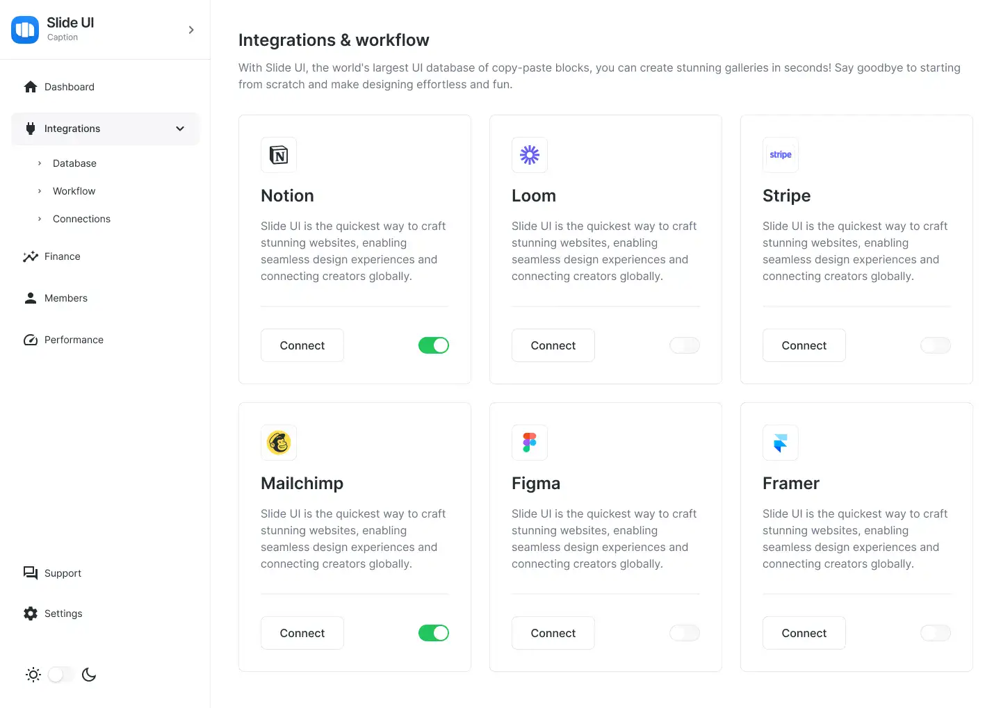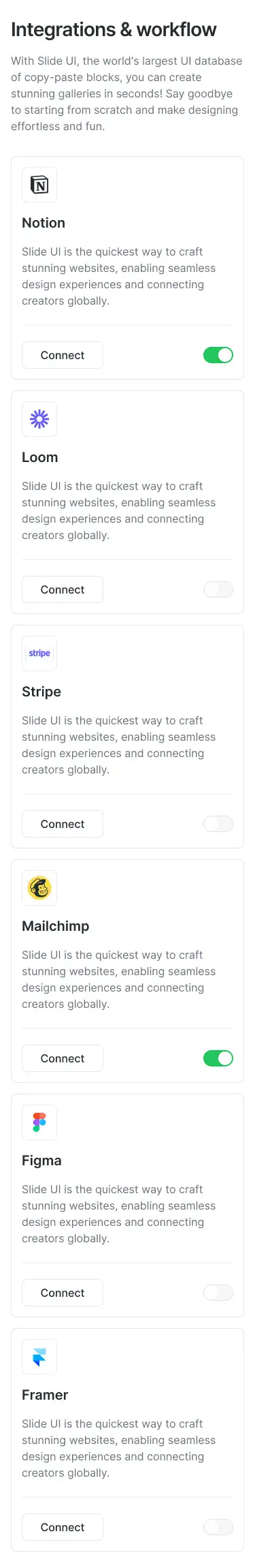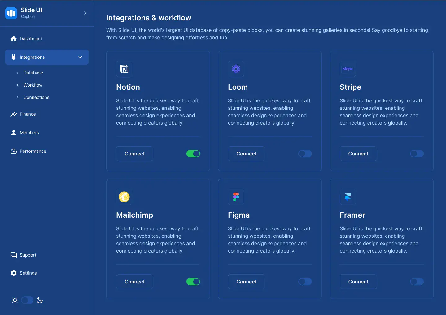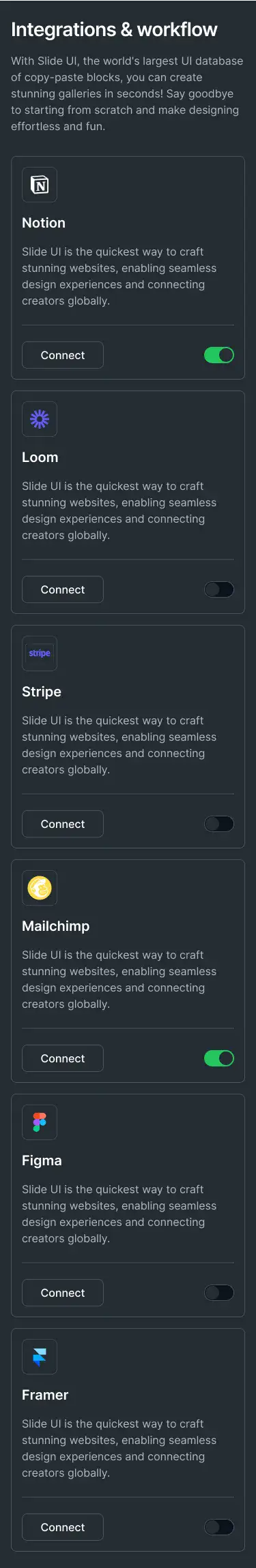 Integrations Layout for Figma — minimal, themeable and responsive across Desktop, Tablet and Mobile. Includes Light, Dark and Accent modes for fast customisation. Ideal for Automotive, Insurance, Marketplace.