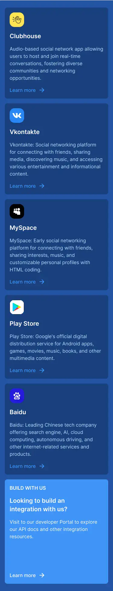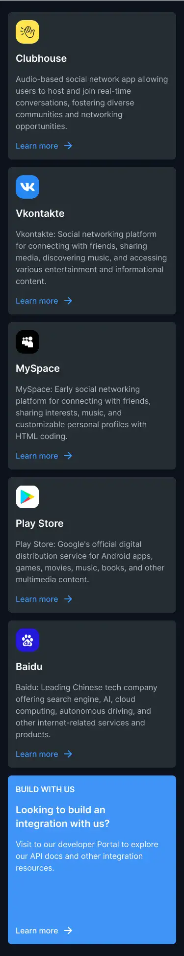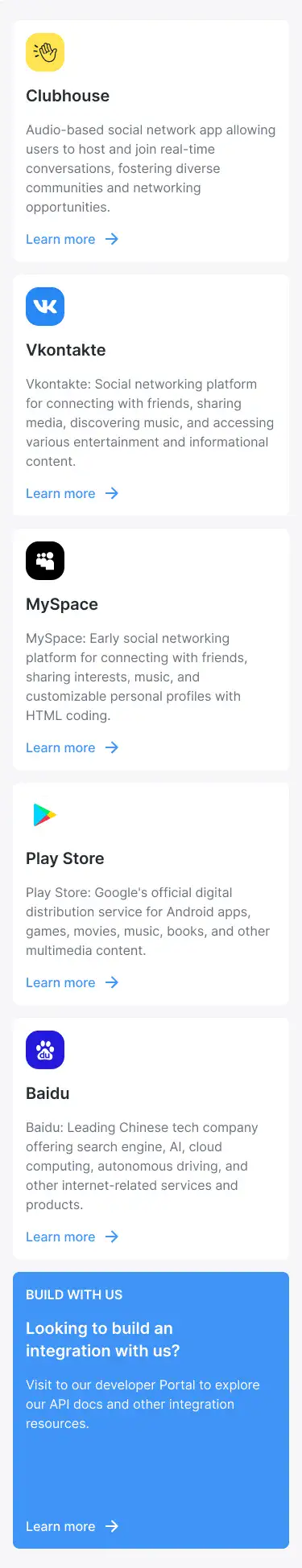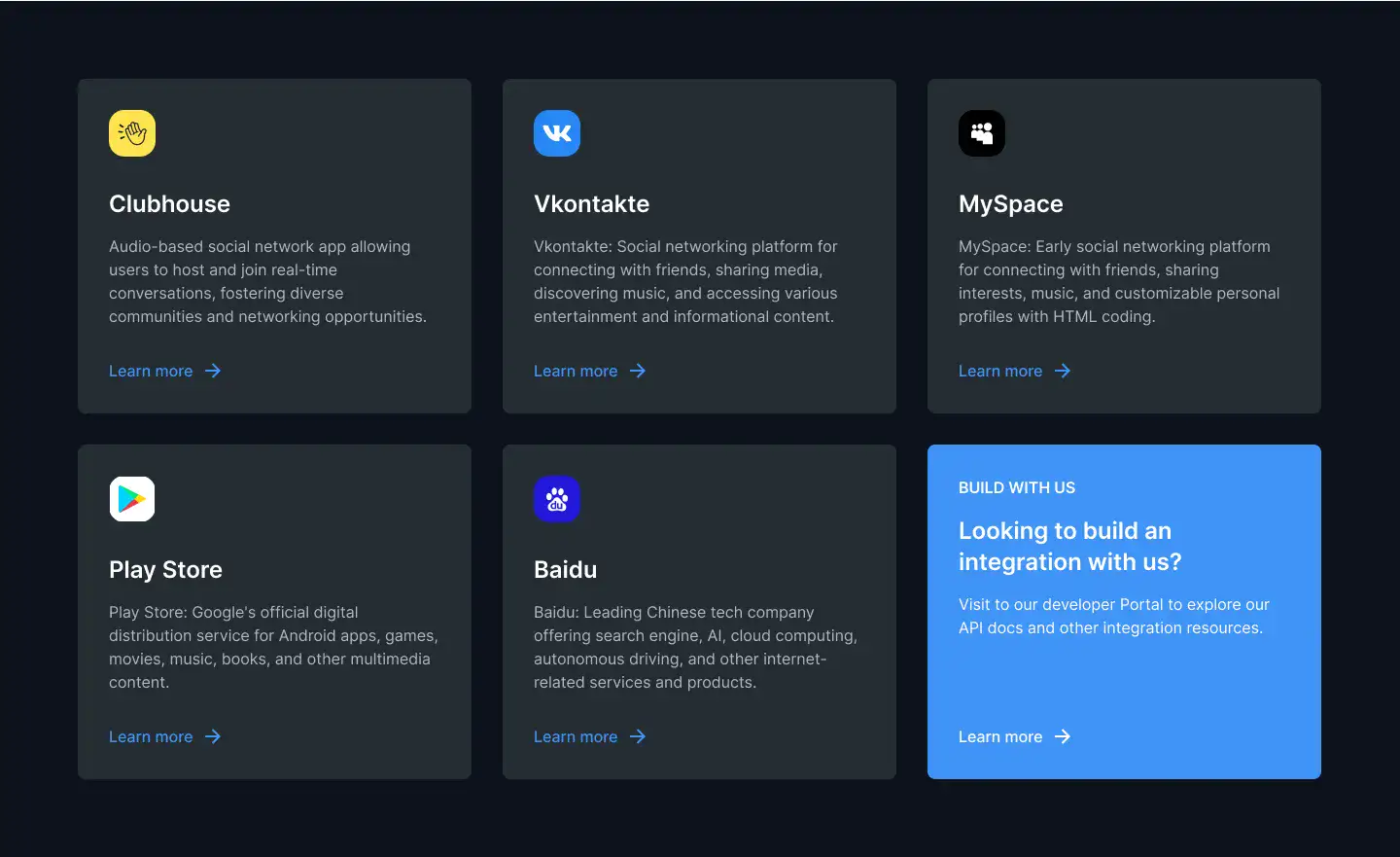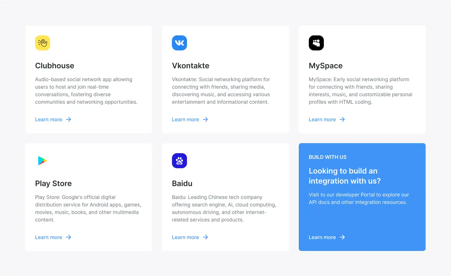 Showcase product integrations visually with logos, categories, and tool descriptions.
