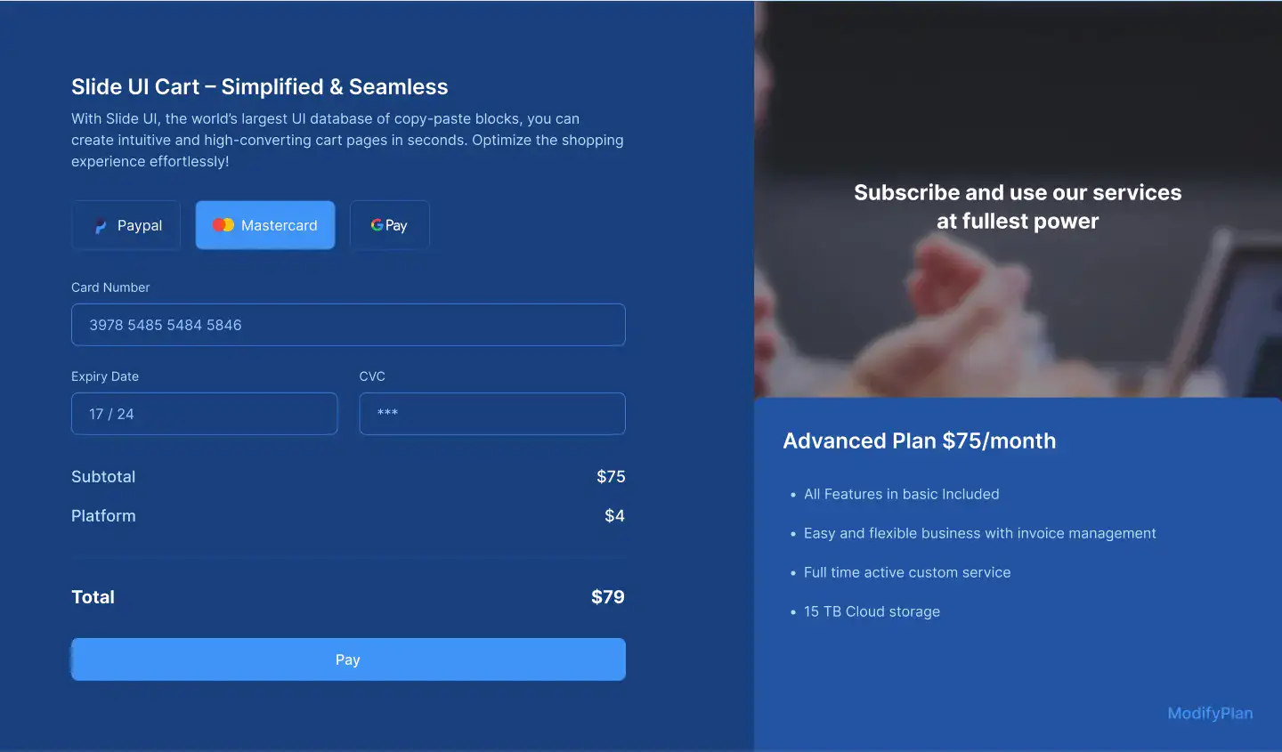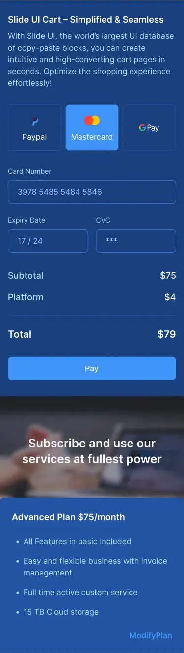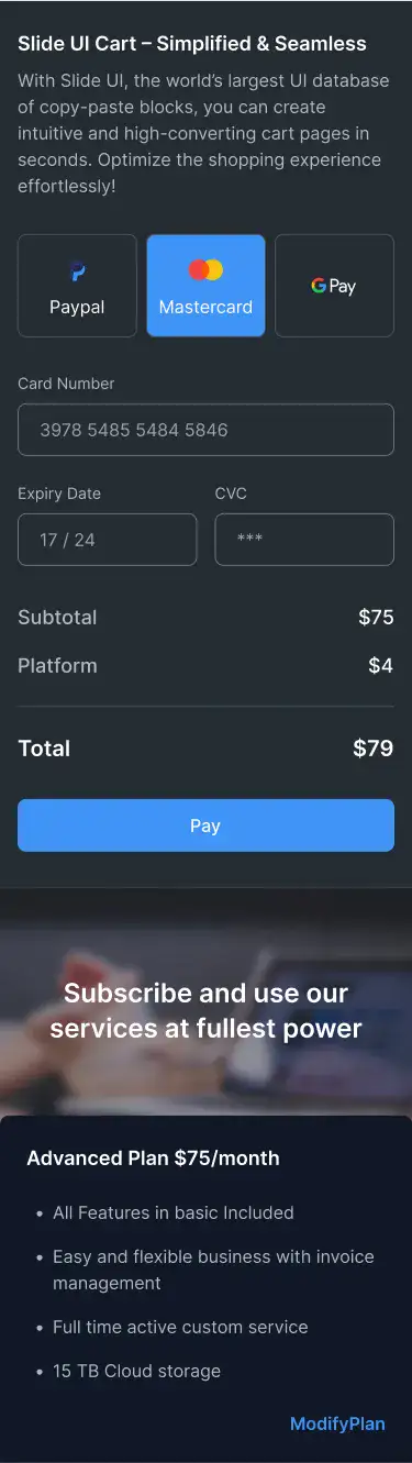 Ecommerce-ready cart, checkout, and payment detail blocks optimised for clarity and conversions.