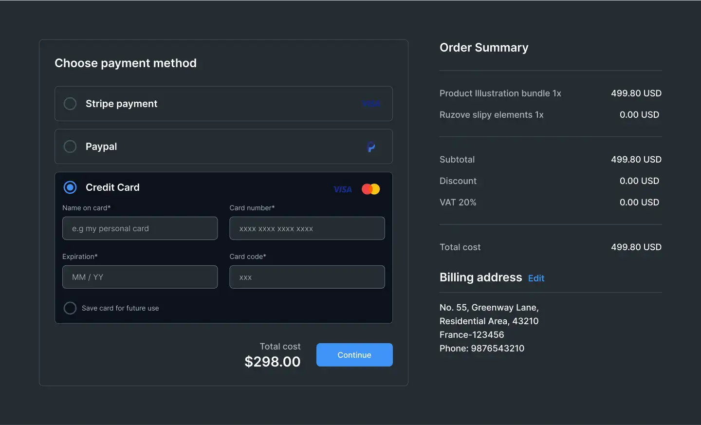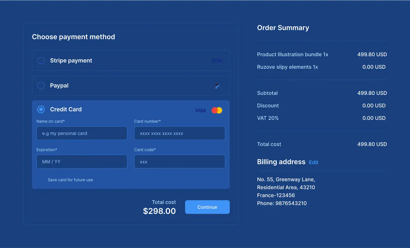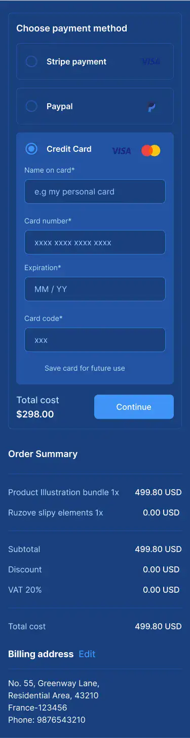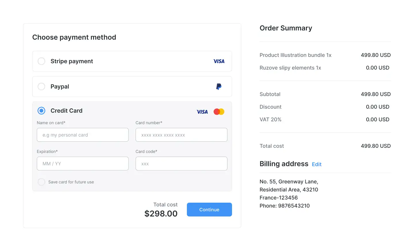 Ecommerce-ready cart, checkout, and payment detail blocks optimised for clarity and conversions.