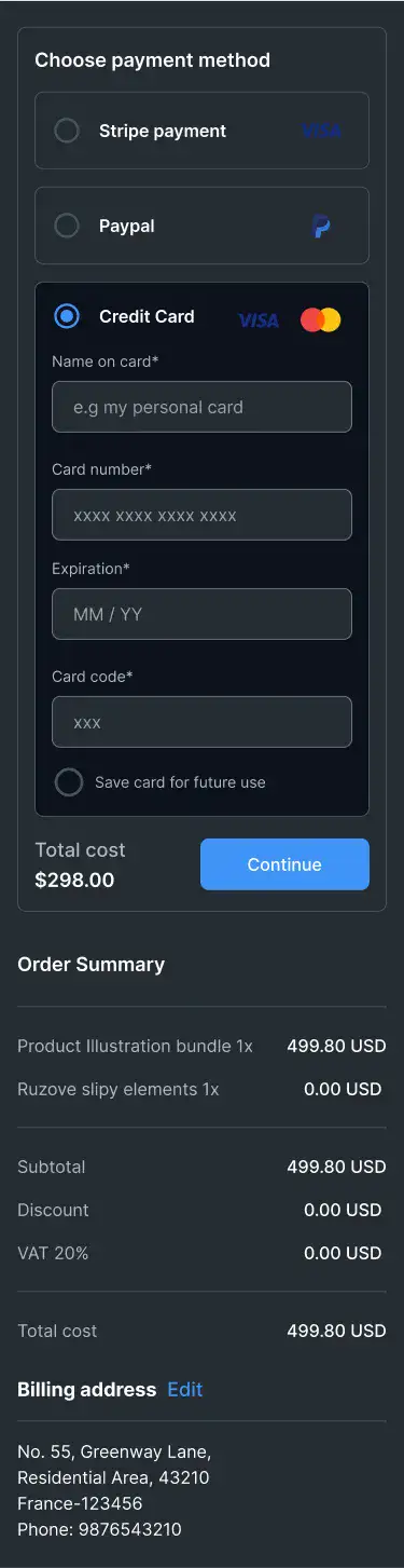 Payment Layout for Figma — minimal, themeable and responsive across Desktop, Tablet and Mobile. Includes Light, Dark and Accent modes for fast customisation. Ideal for Finance, Fitness, Insurance.