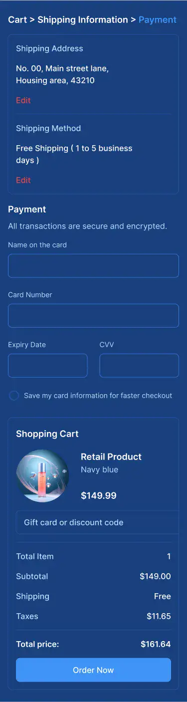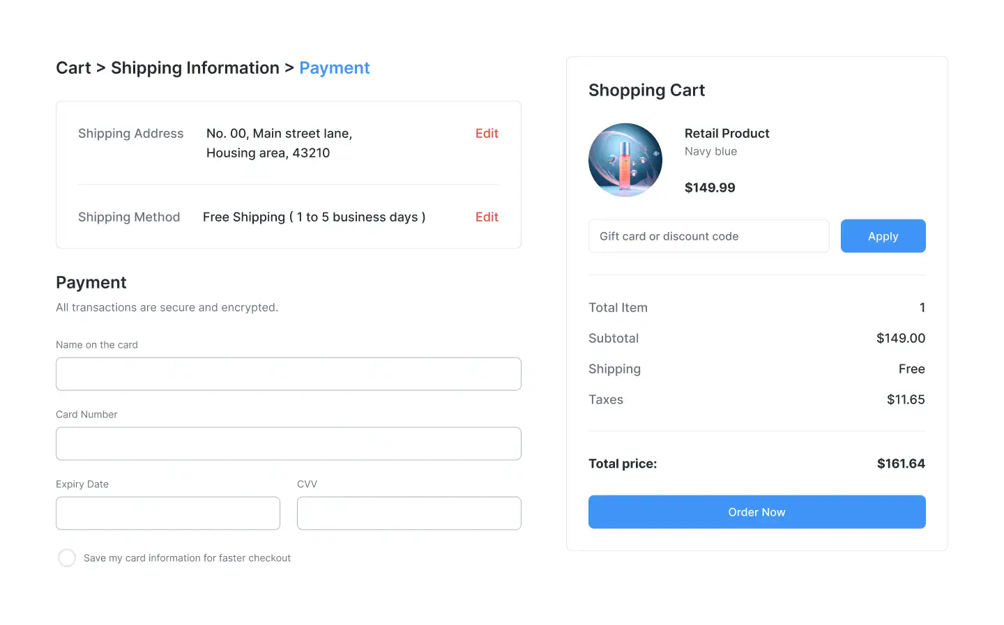 Ecommerce-ready cart, checkout, and payment detail blocks optimised for clarity and conversions.