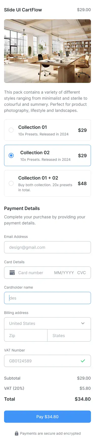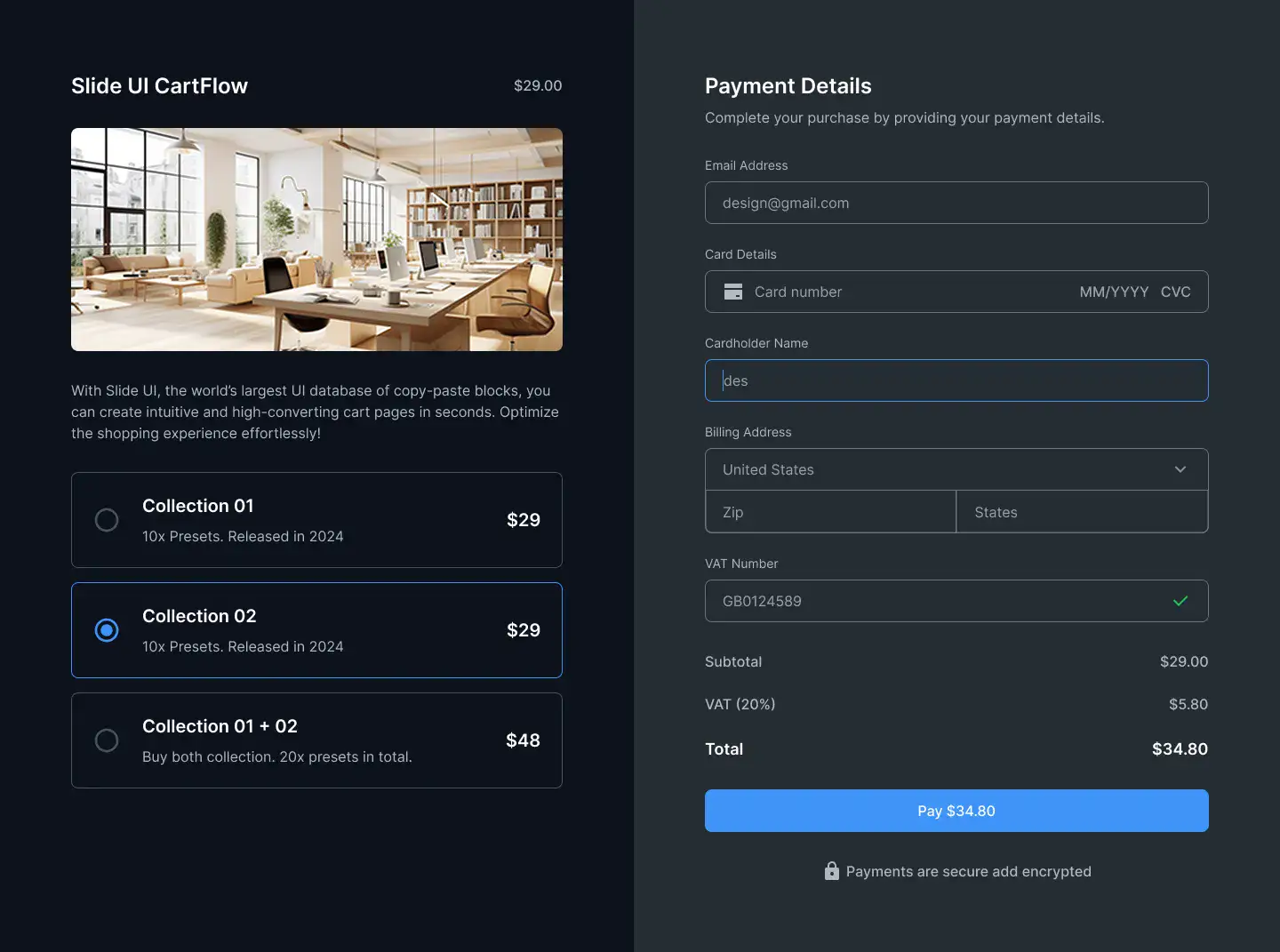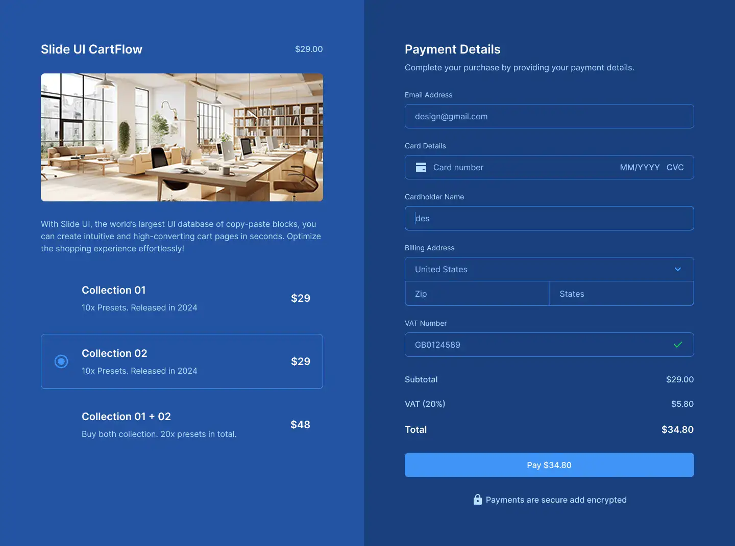 Ecommerce-ready cart, checkout, and payment detail blocks optimised for clarity and conversions.