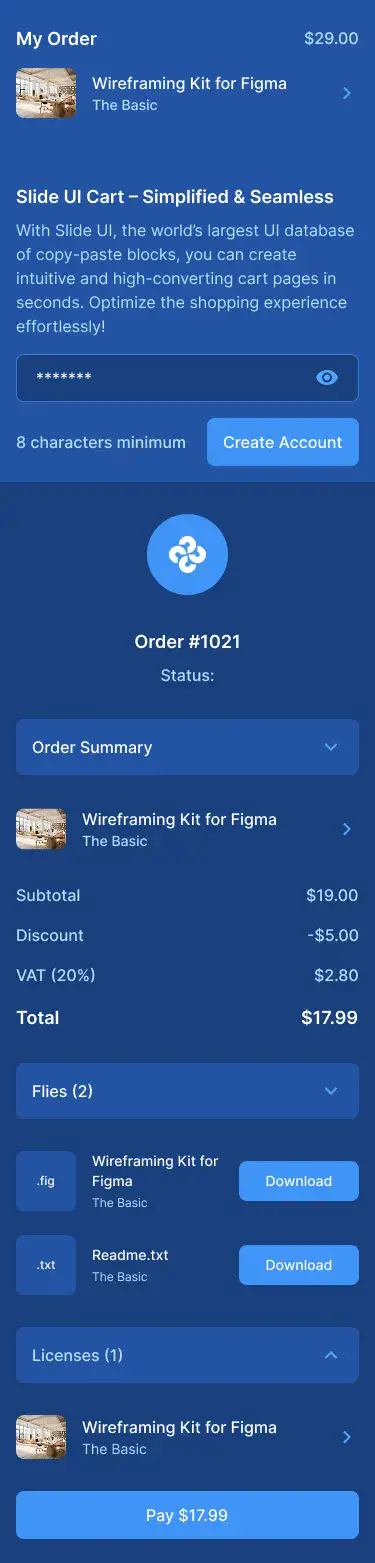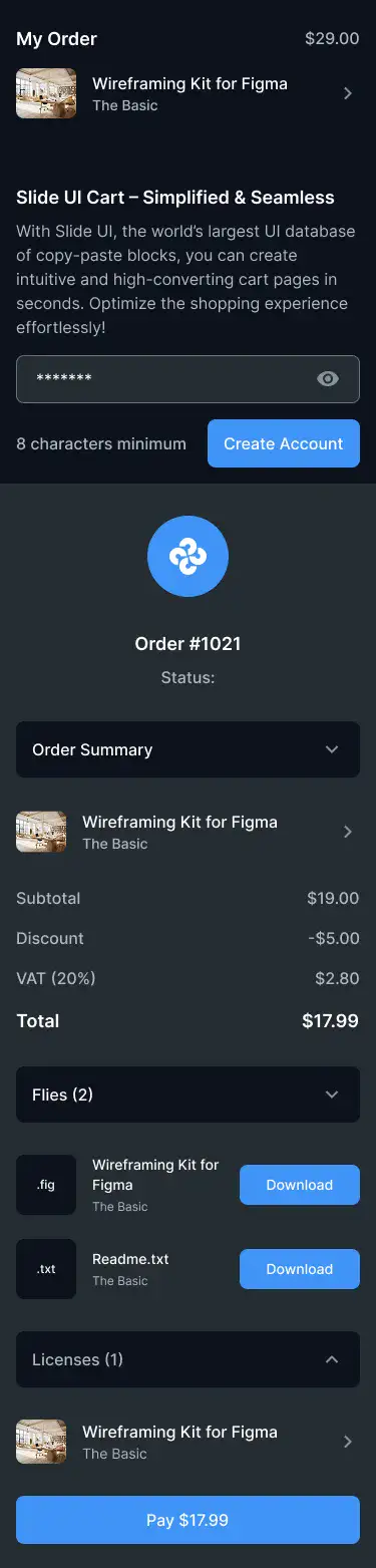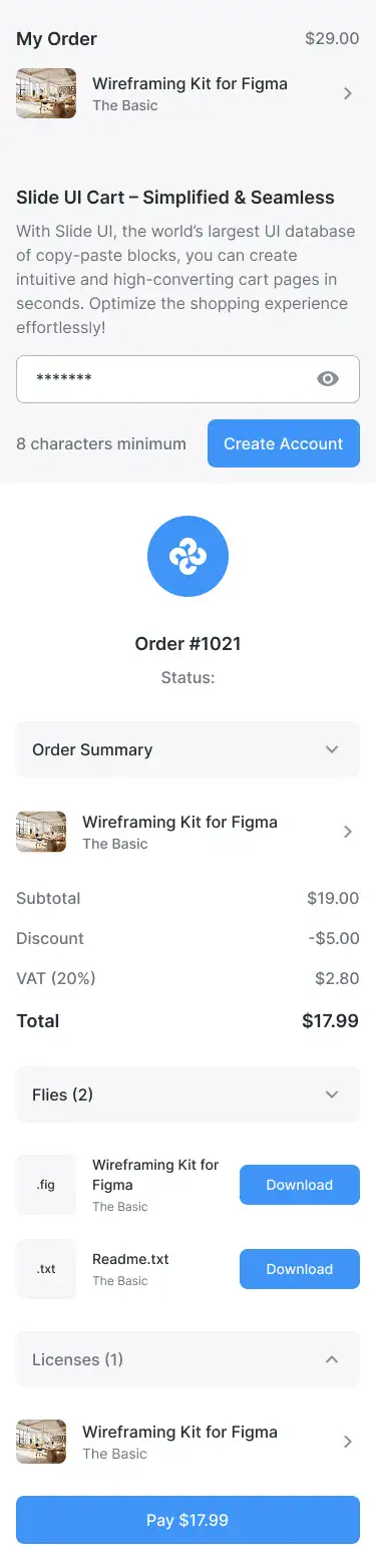 Ecommerce-ready cart, checkout, and payment detail blocks optimised for clarity and conversions.