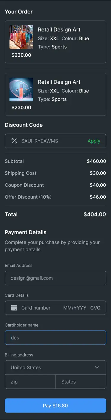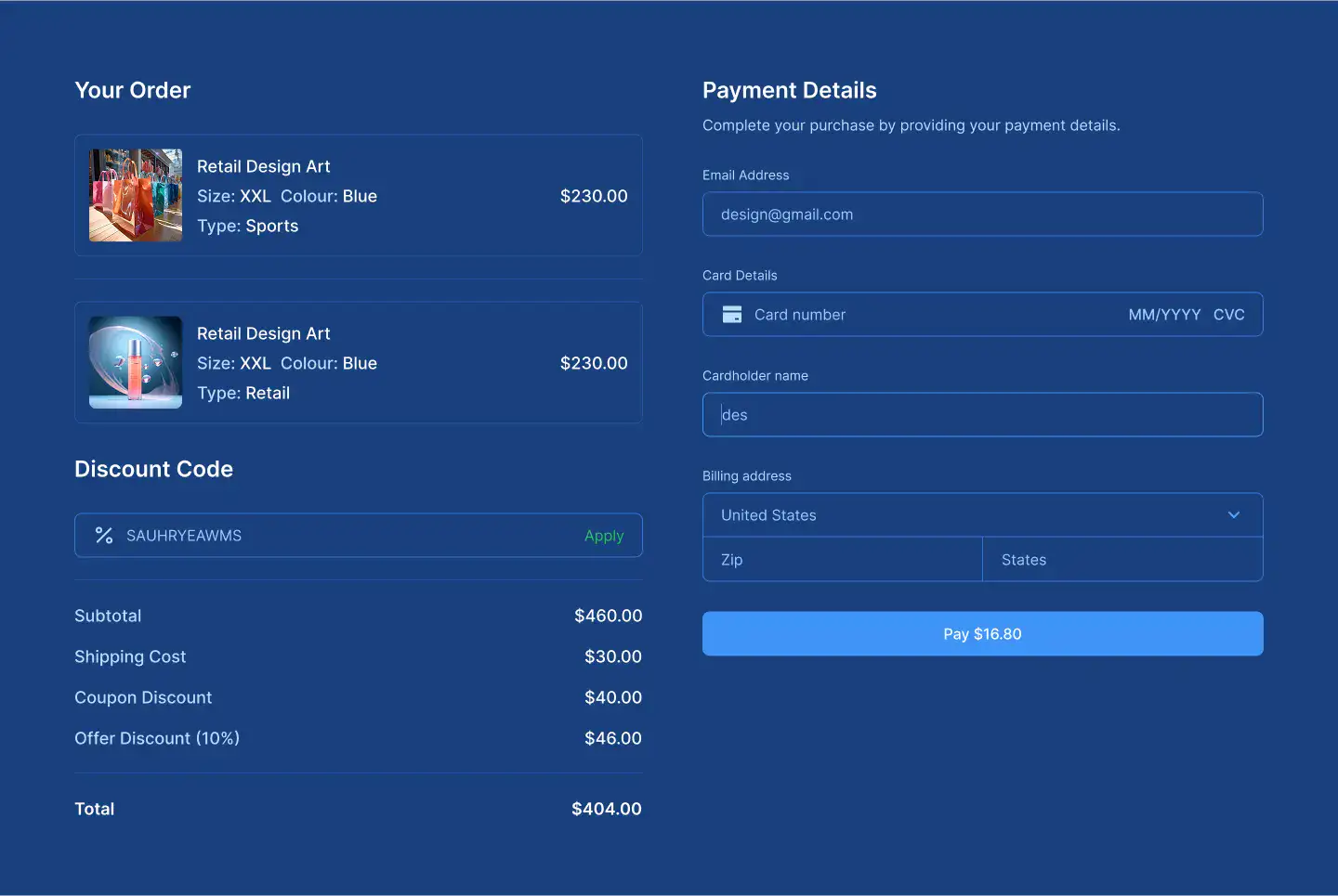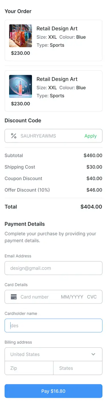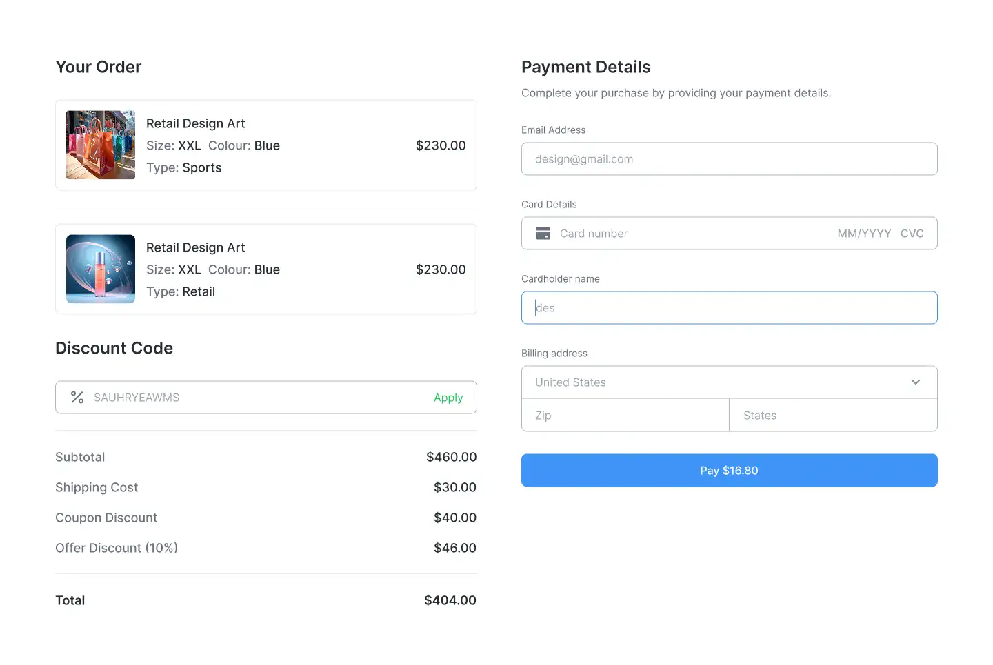Ecommerce-ready cart, checkout, and payment detail blocks optimised for clarity and conversions.