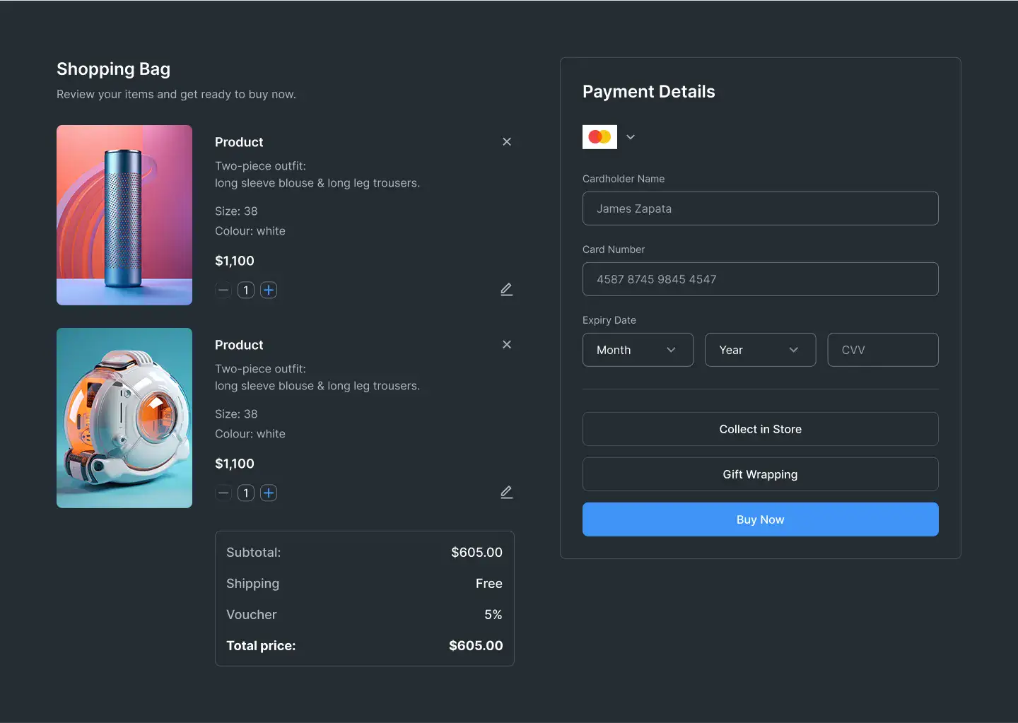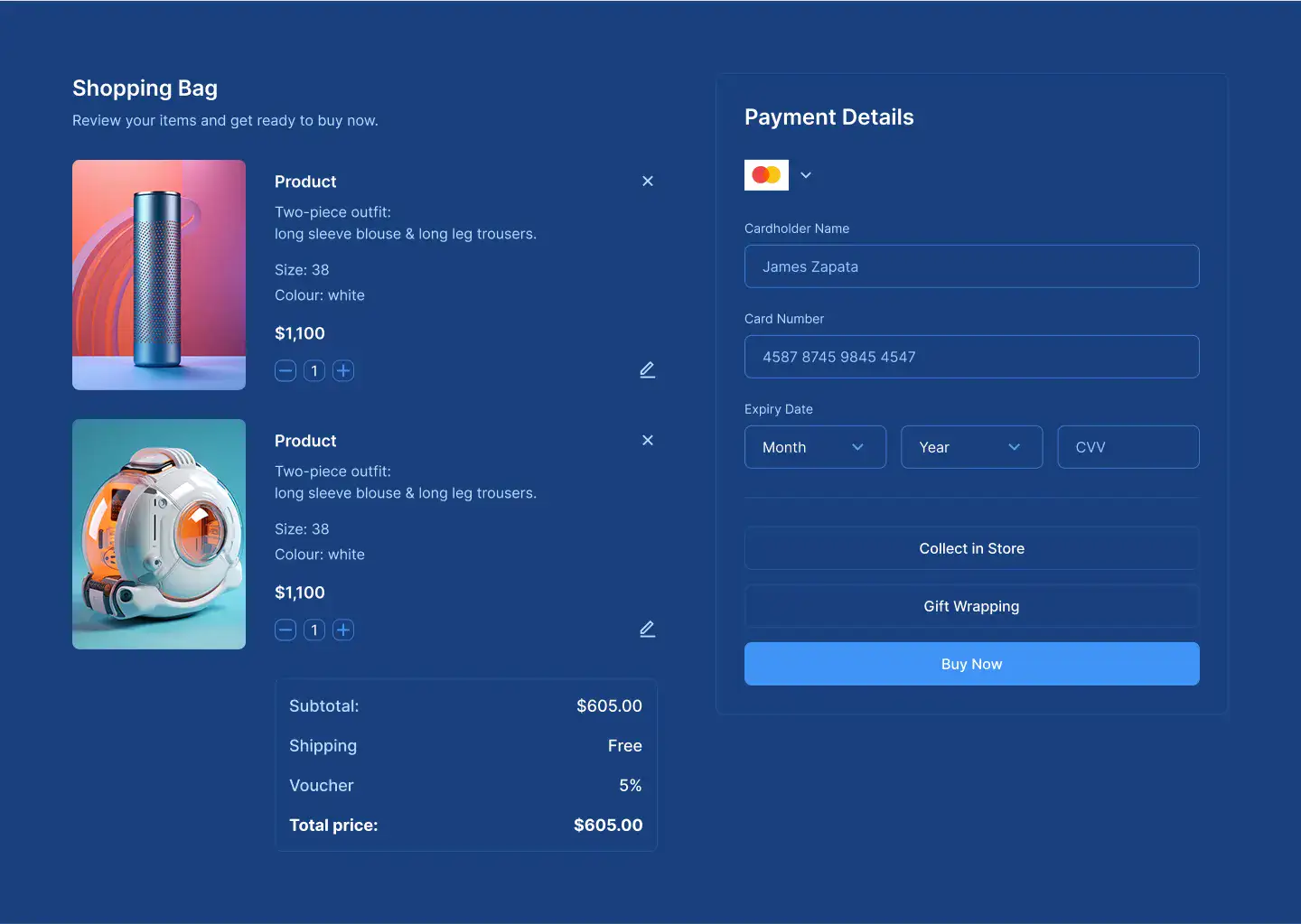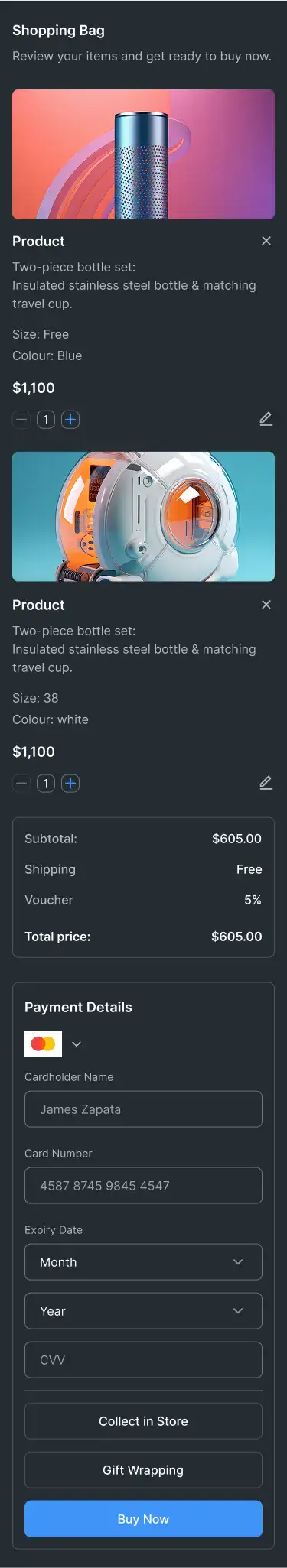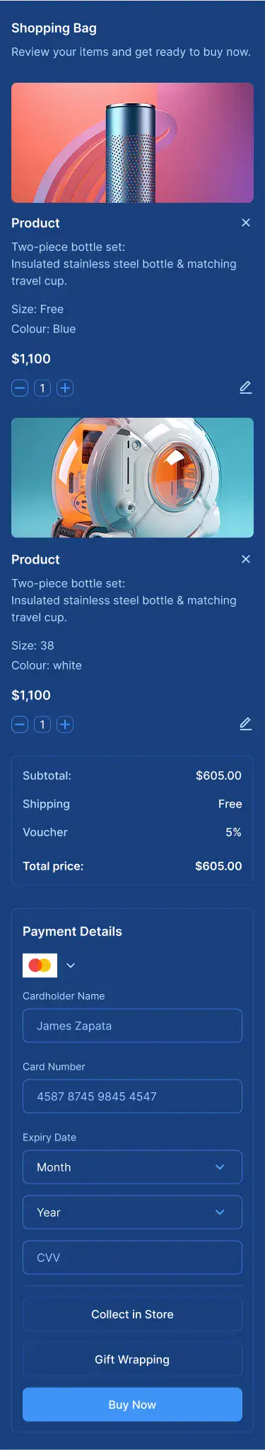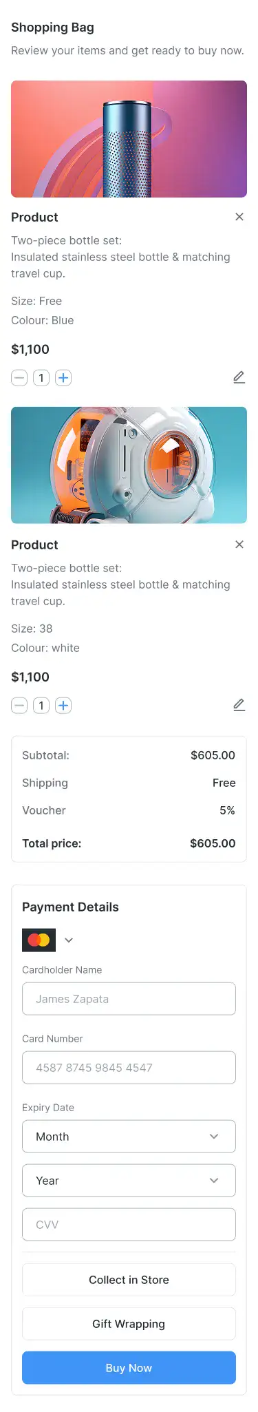 Ecommerce-ready cart, checkout, and payment detail blocks optimised for clarity and conversions.