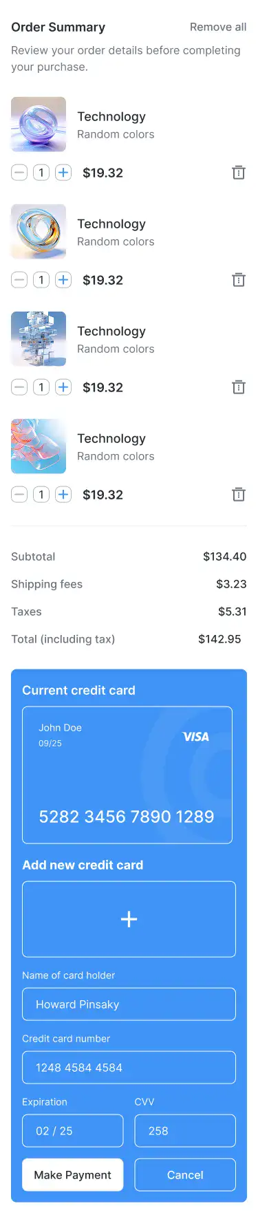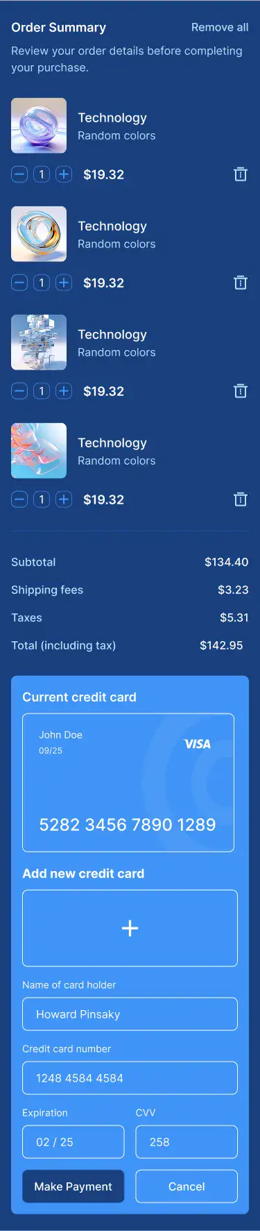 Ecommerce-ready cart, checkout, and payment detail blocks optimised for clarity and conversions.