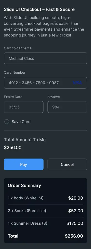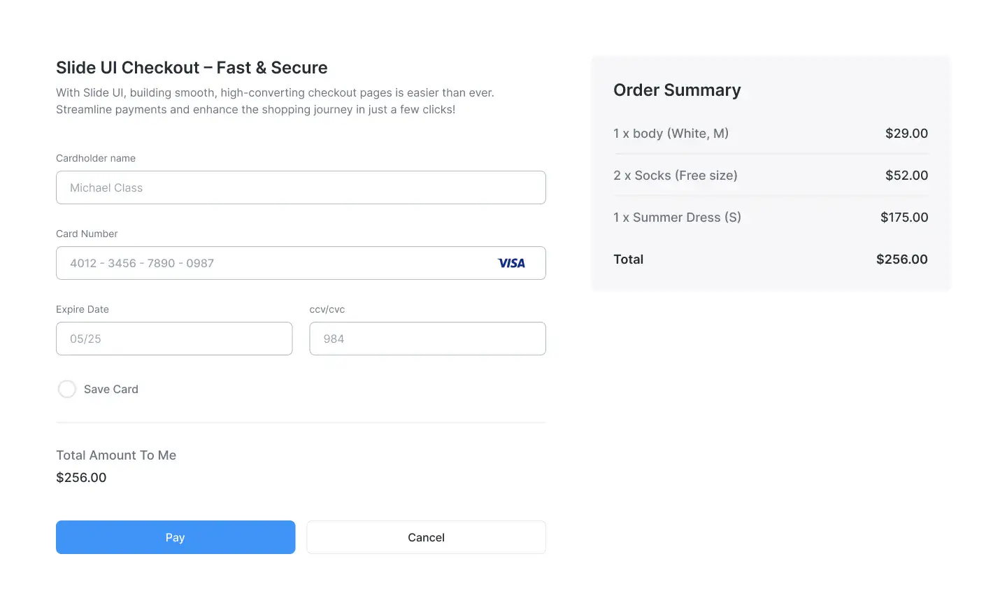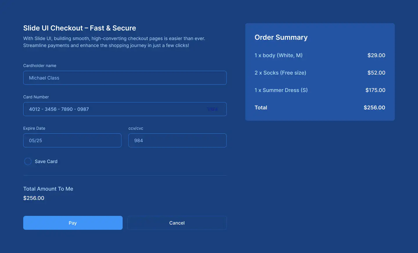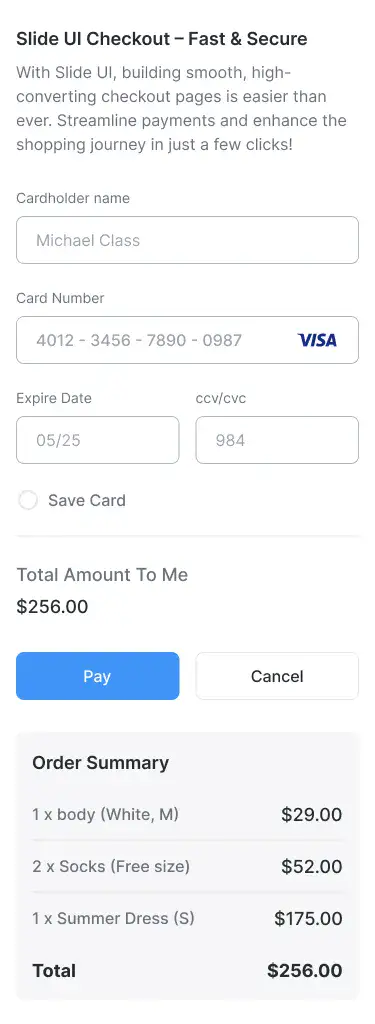 Ecommerce-ready cart, checkout, and payment detail blocks optimised for clarity and conversions.