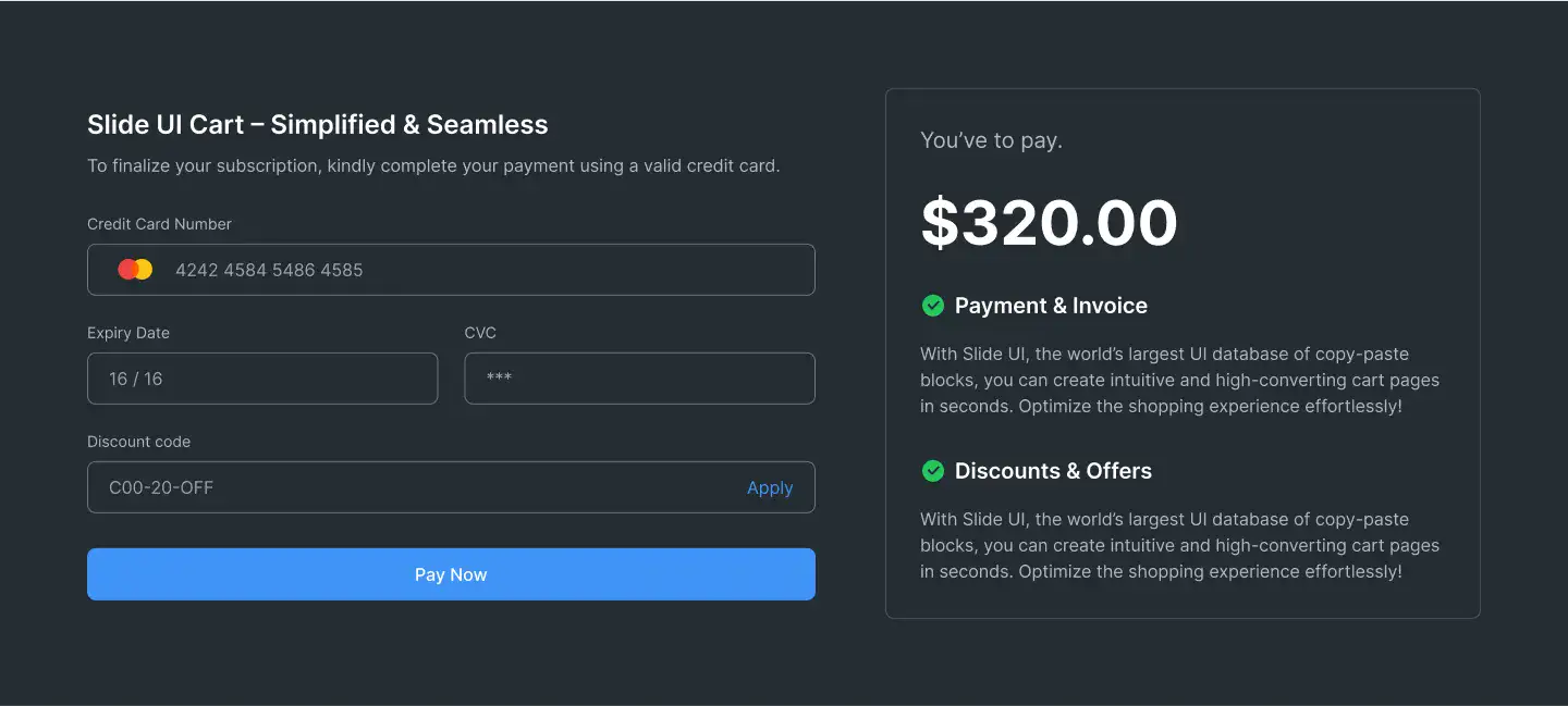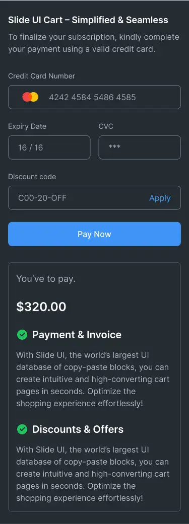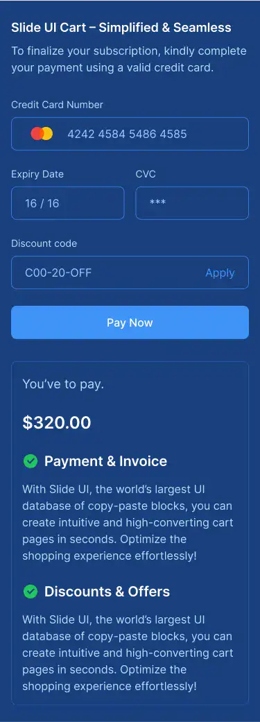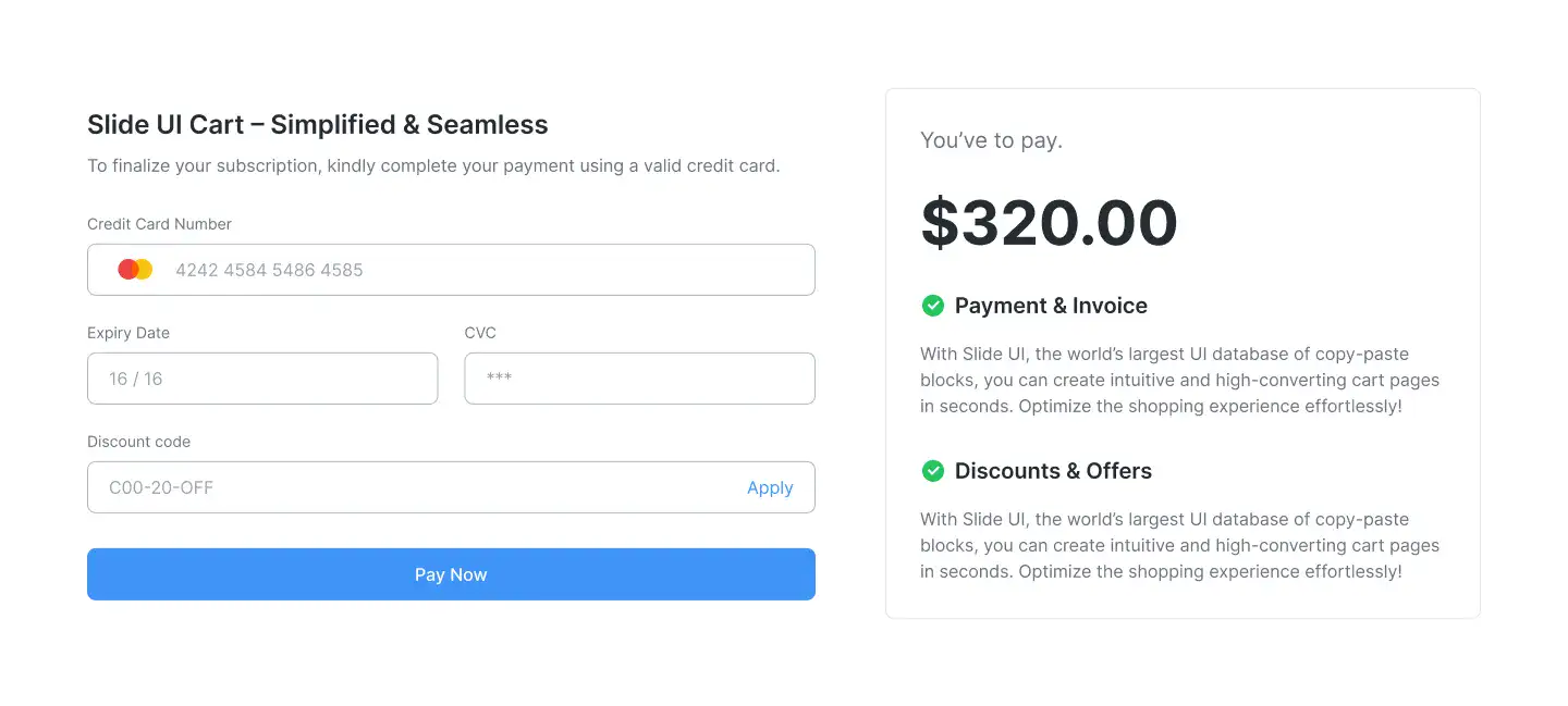 Ecommerce-ready cart, checkout, and payment detail blocks optimised for clarity and conversions.