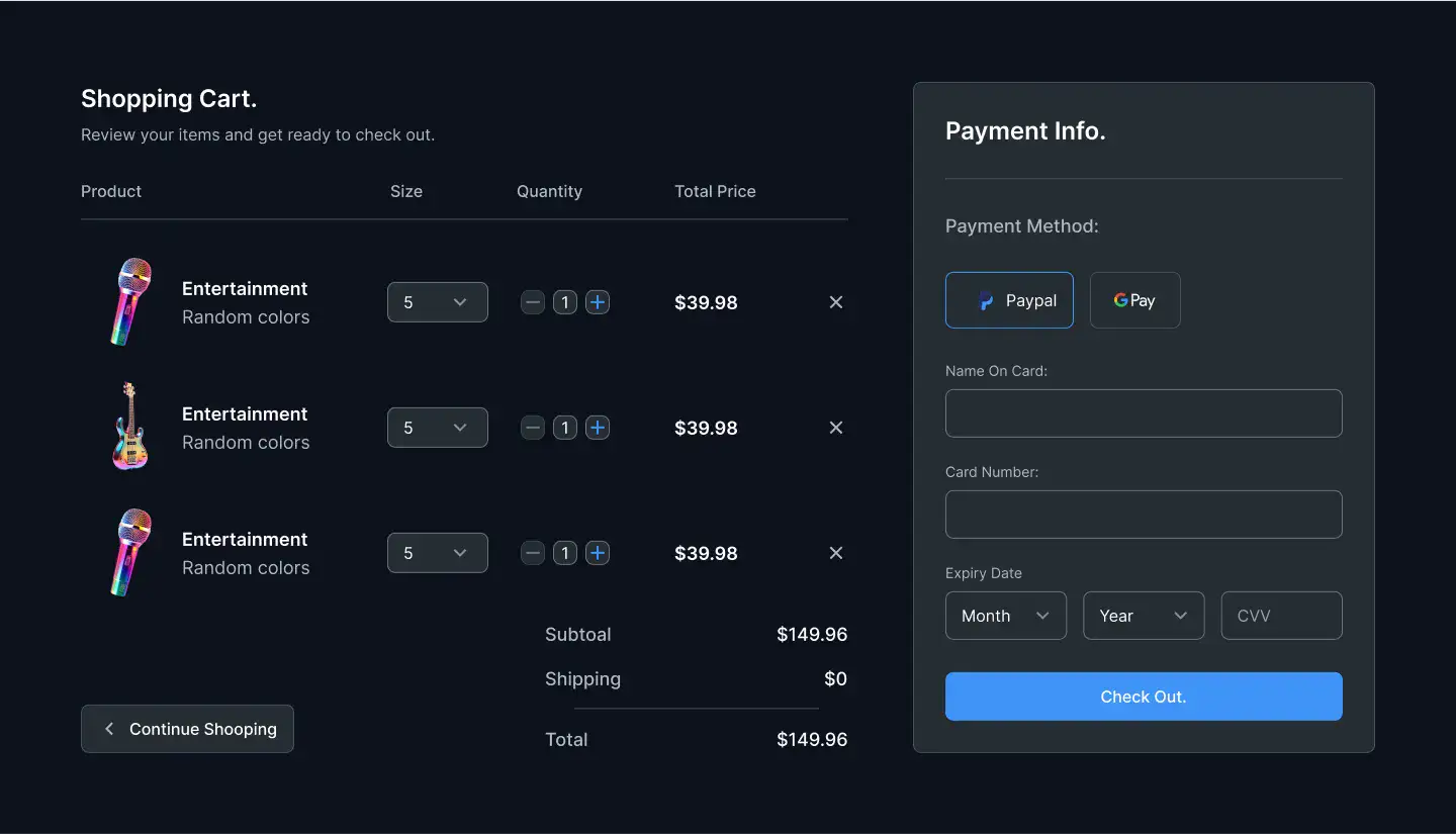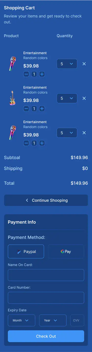 Ecommerce-ready cart, checkout, and payment detail blocks optimised for clarity and conversions.
