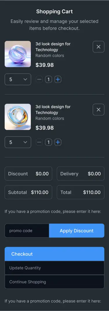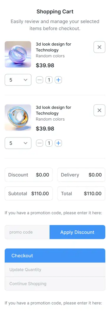 Ecommerce-ready cart, checkout, and payment detail blocks optimised for clarity and conversions.