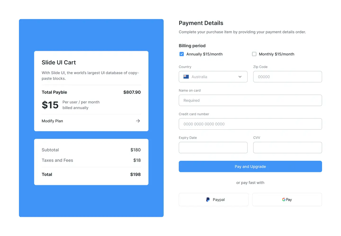 Ecommerce-ready cart, checkout, and payment detail blocks optimised for clarity and conversions.