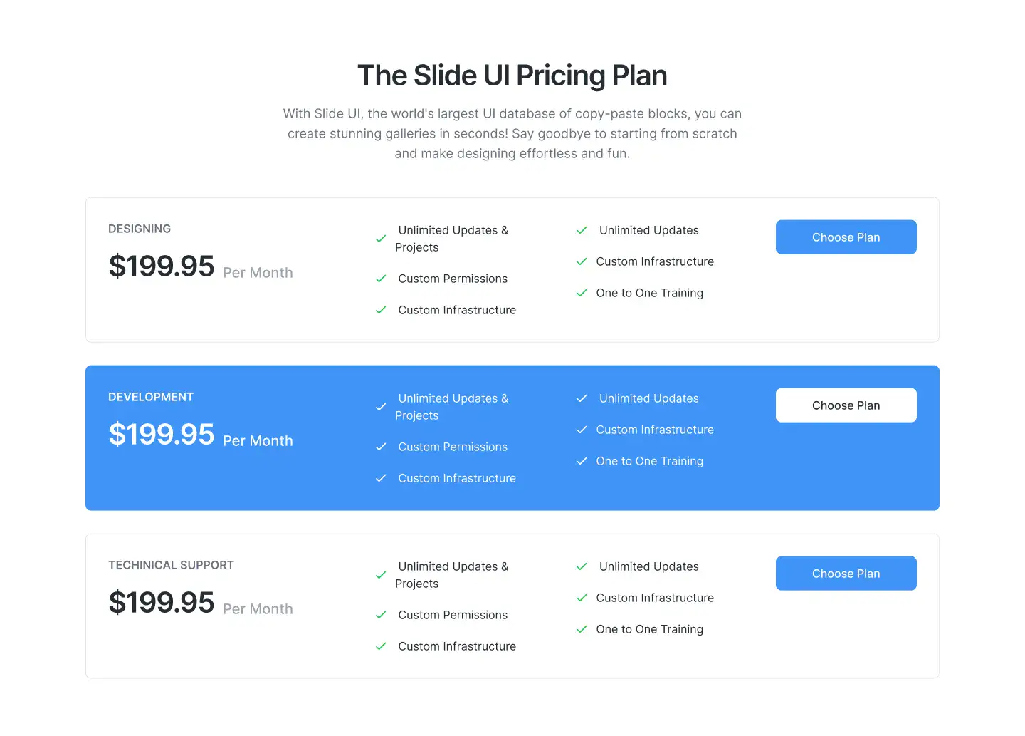 Break down feature differences clearly using side-by-side or table-style layouts. Great for upsell pages.