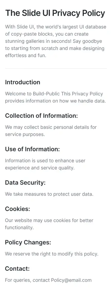 Privacy Policy Layout for Figma — clean, themeable and responsive across Desktop, Tablet and Mobile. Includes Light, Dark and Accent modes for fast customisation. Ideal for Marketplace, Restaurant, Travel.
