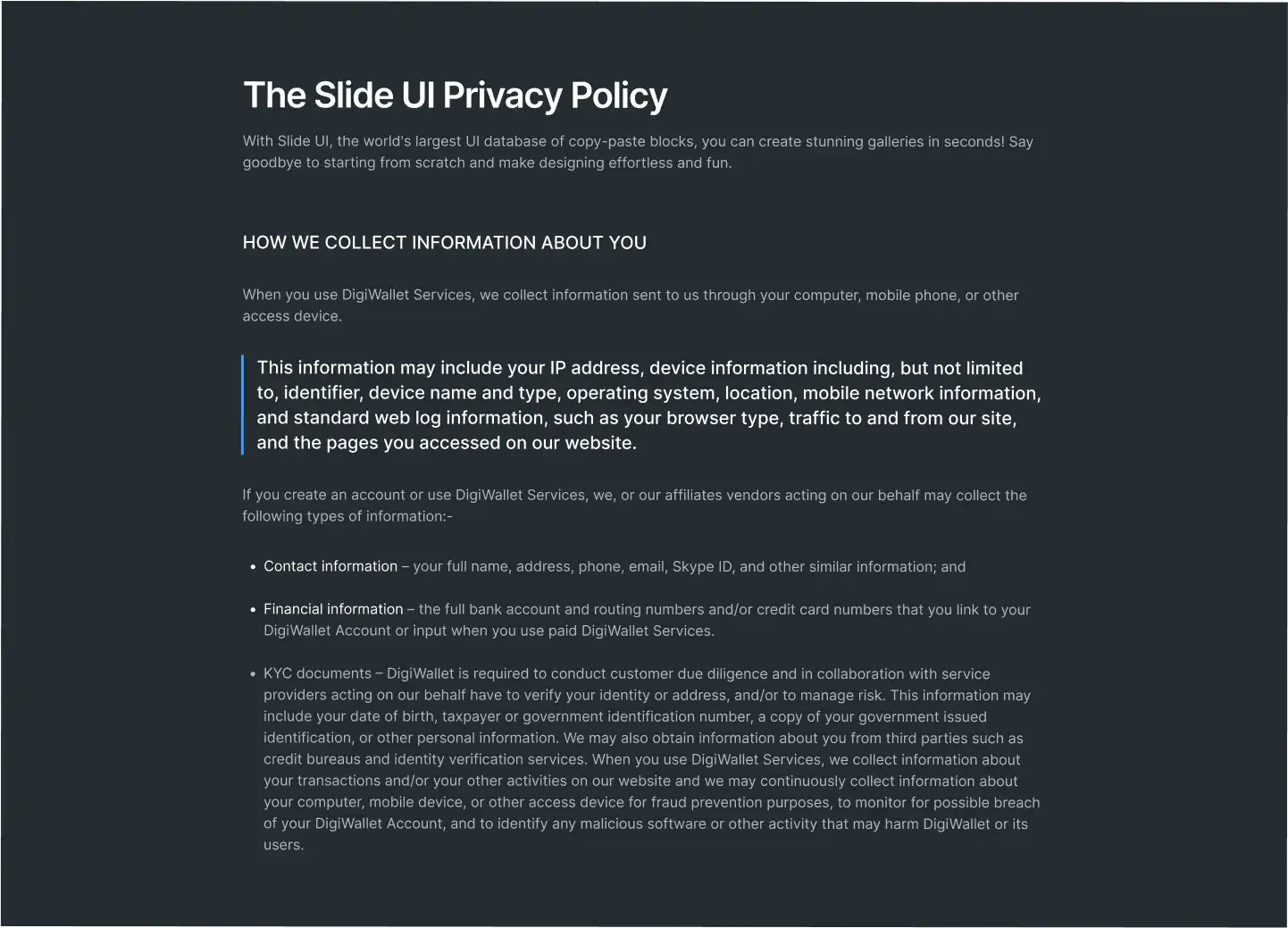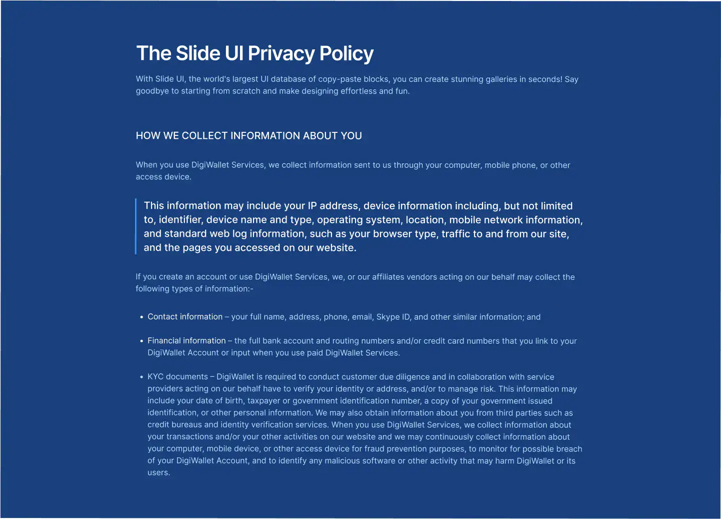 Privacy Policy Layout for Figma — clean, themeable and responsive across Desktop, Tablet and Mobile. Includes Light, Dark and Accent modes for fast customisation. Ideal for Finance, Government, Restaurant.