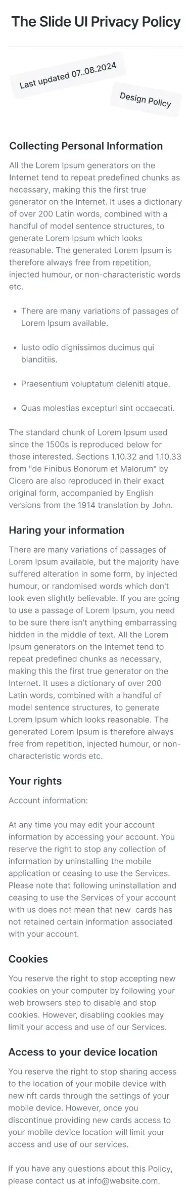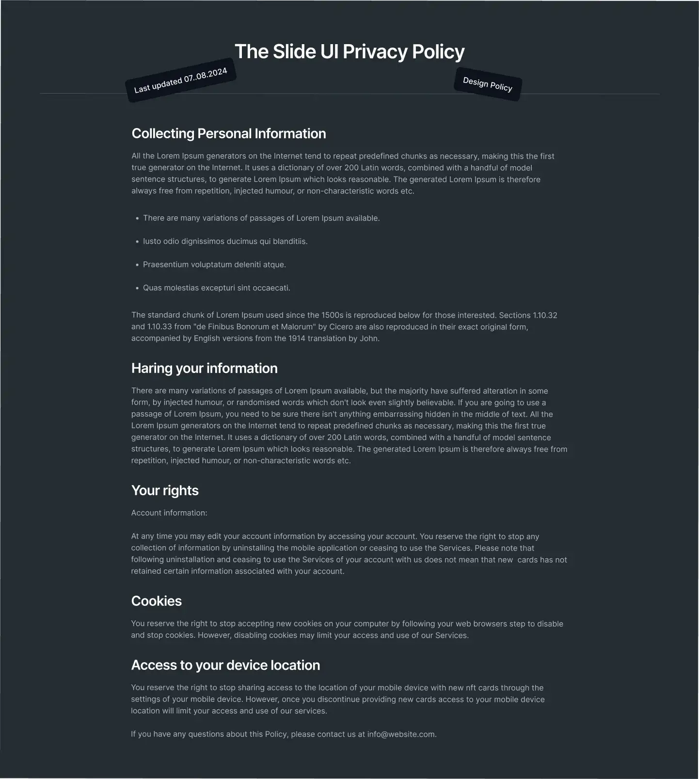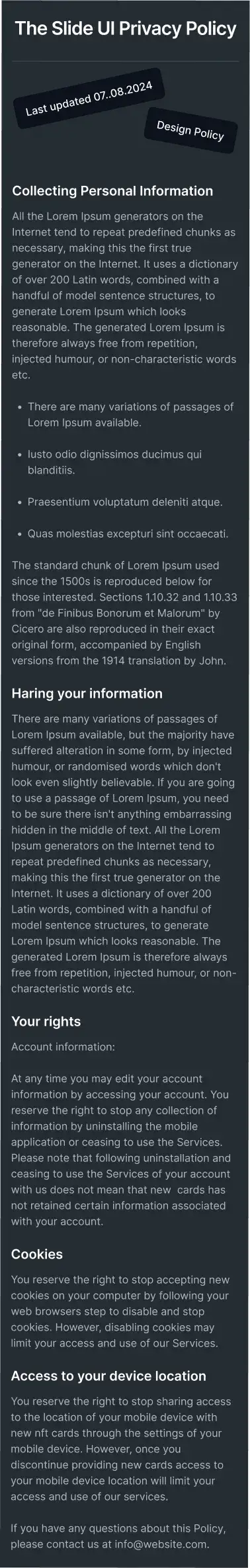 Privacy Policy Layout for Figma — clean, themeable and responsive across Desktop, Tablet and Mobile. Includes Light, Dark and Accent modes for fast customisation. Ideal for Energy, Events, Fintech.