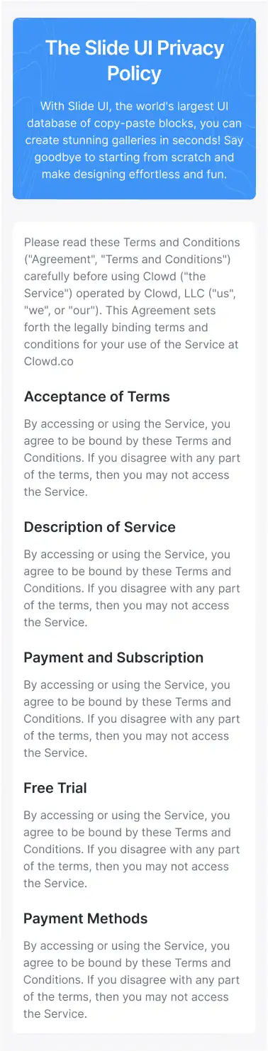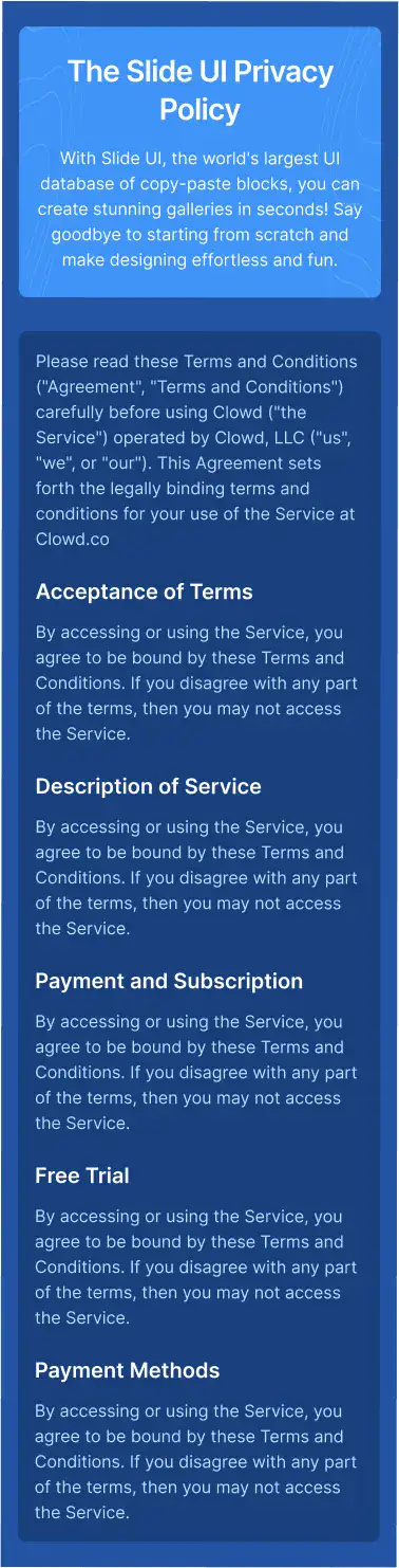 Privacy Policy Layout for Figma — modern, themeable and responsive across Desktop, Tablet and Mobile. Includes Light, Dark and Accent modes for fast customisation. Ideal for Automotive, Ecommerce, Events.