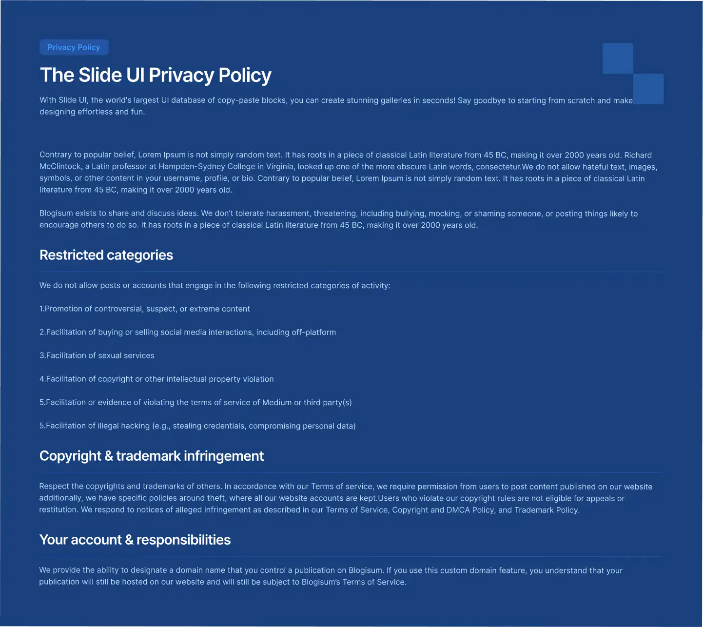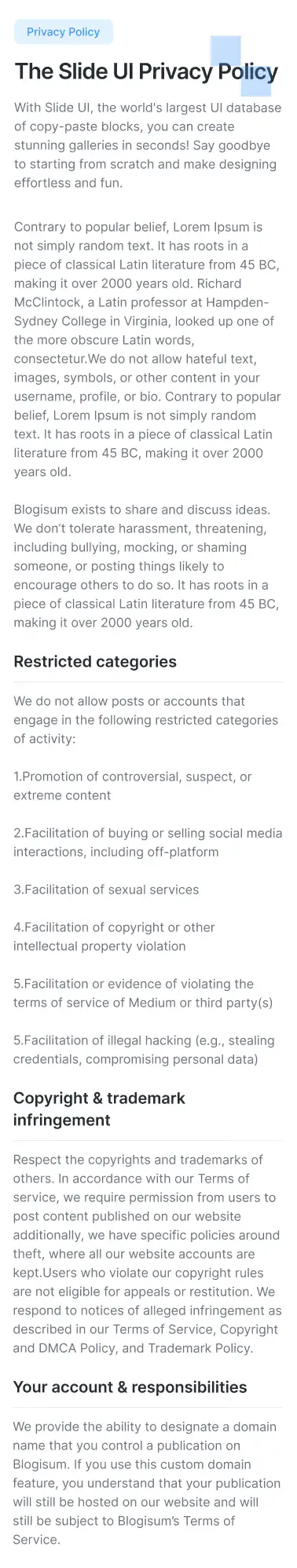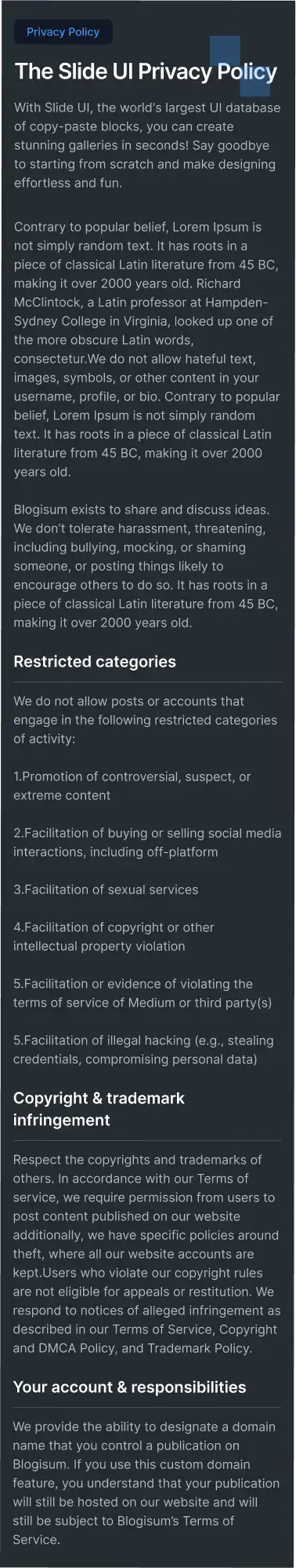 Privacy Policy Layout for Figma — swiss, themeable and responsive across Desktop, Tablet and Mobile. Includes Light, Dark and Accent modes for fast customisation. Ideal for Gaming, Law, Marketplace.