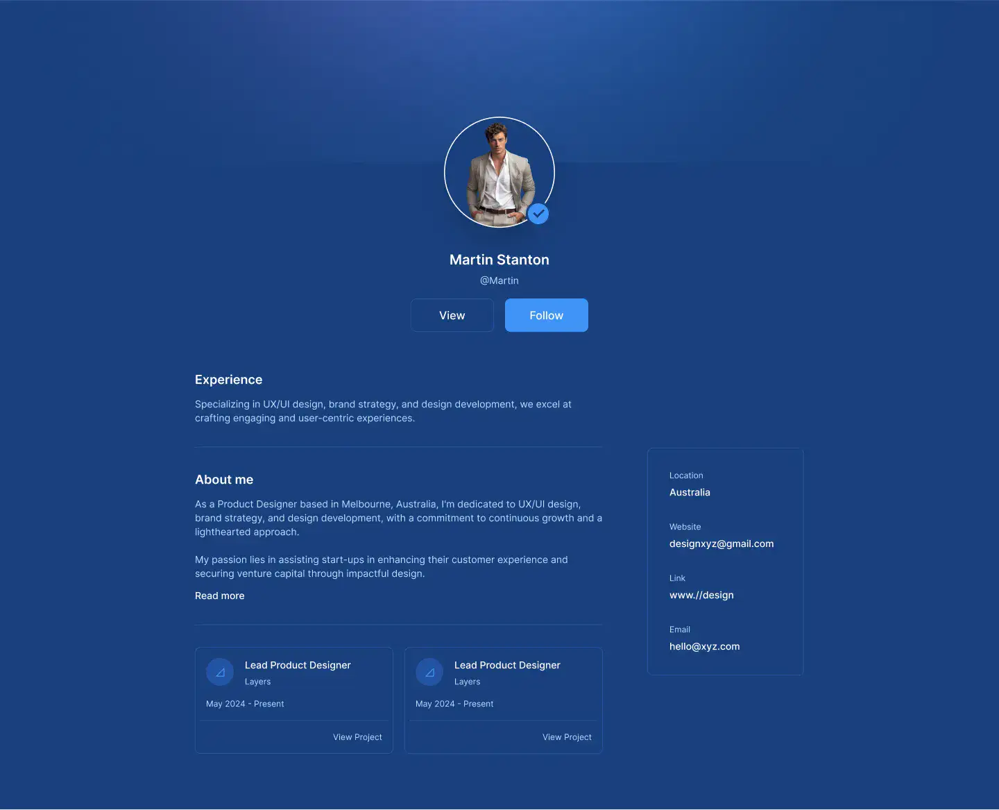 Profile Layout for Figma — swiss, themeable and responsive across Desktop, Tablet and Mobile. Includes Light, Dark and Accent modes for fast customisation. Ideal for Ecommerce, Hotel, Job Board.