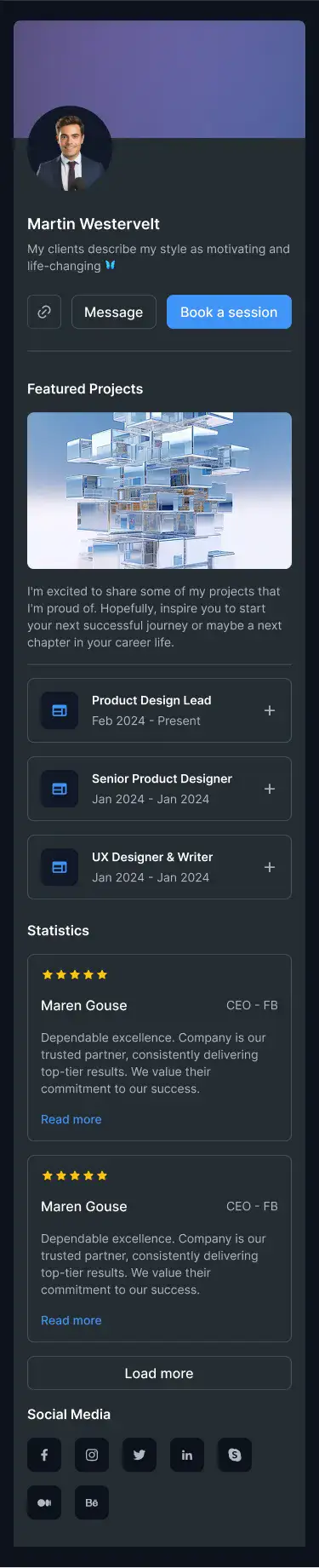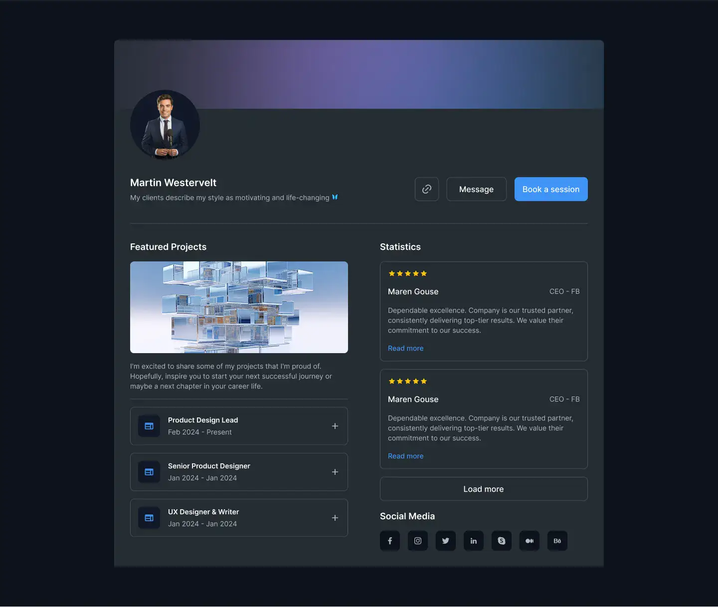 Profile Layout for Figma — swiss, themeable and responsive across Desktop, Tablet and Mobile. Includes Light, Dark and Accent modes for fast customisation. Ideal for Gaming, Government, Insurance.